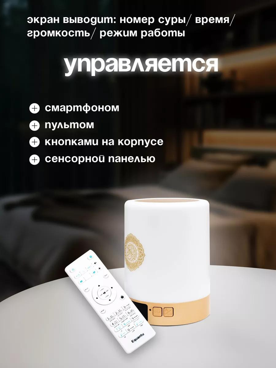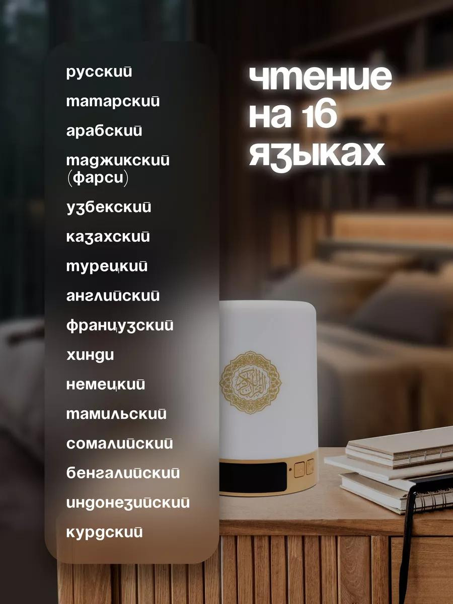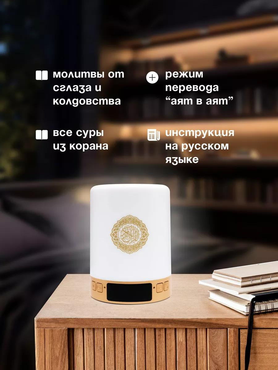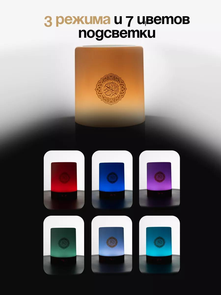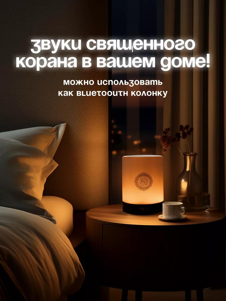 Лампа-ночник с чтением Корана на 16 языках — это многофункциональный аксессуар, сочетающий мягкое освещение и религиозные аудиофункции.