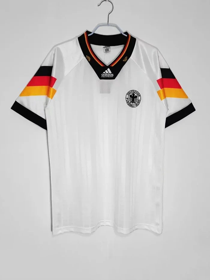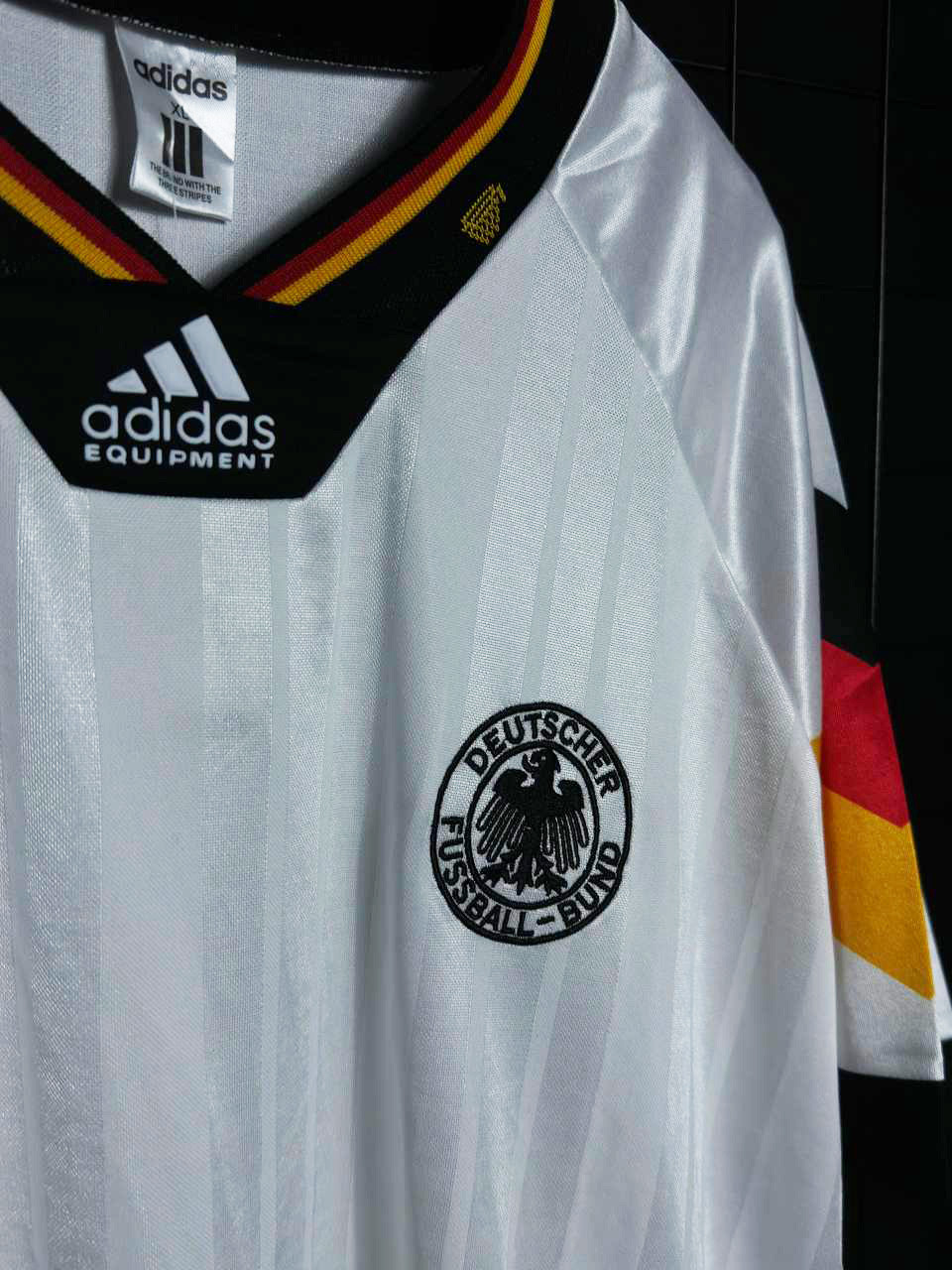 Культовая футболка, вдохновленная триумфальным стилем 90-х! Эта белая футболка сборной Германии с фирменными черно-красно-желтыми полосами на рукавах — настоящий символ эпохи и мощной футбольной истории.