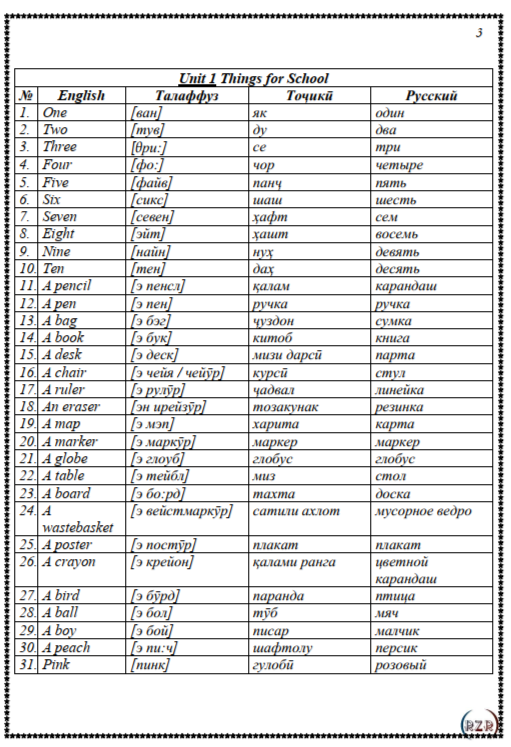 Основной лексический запас для школьников, включая цифры, школьные принадлежности, цвета и другие базовые понятия.