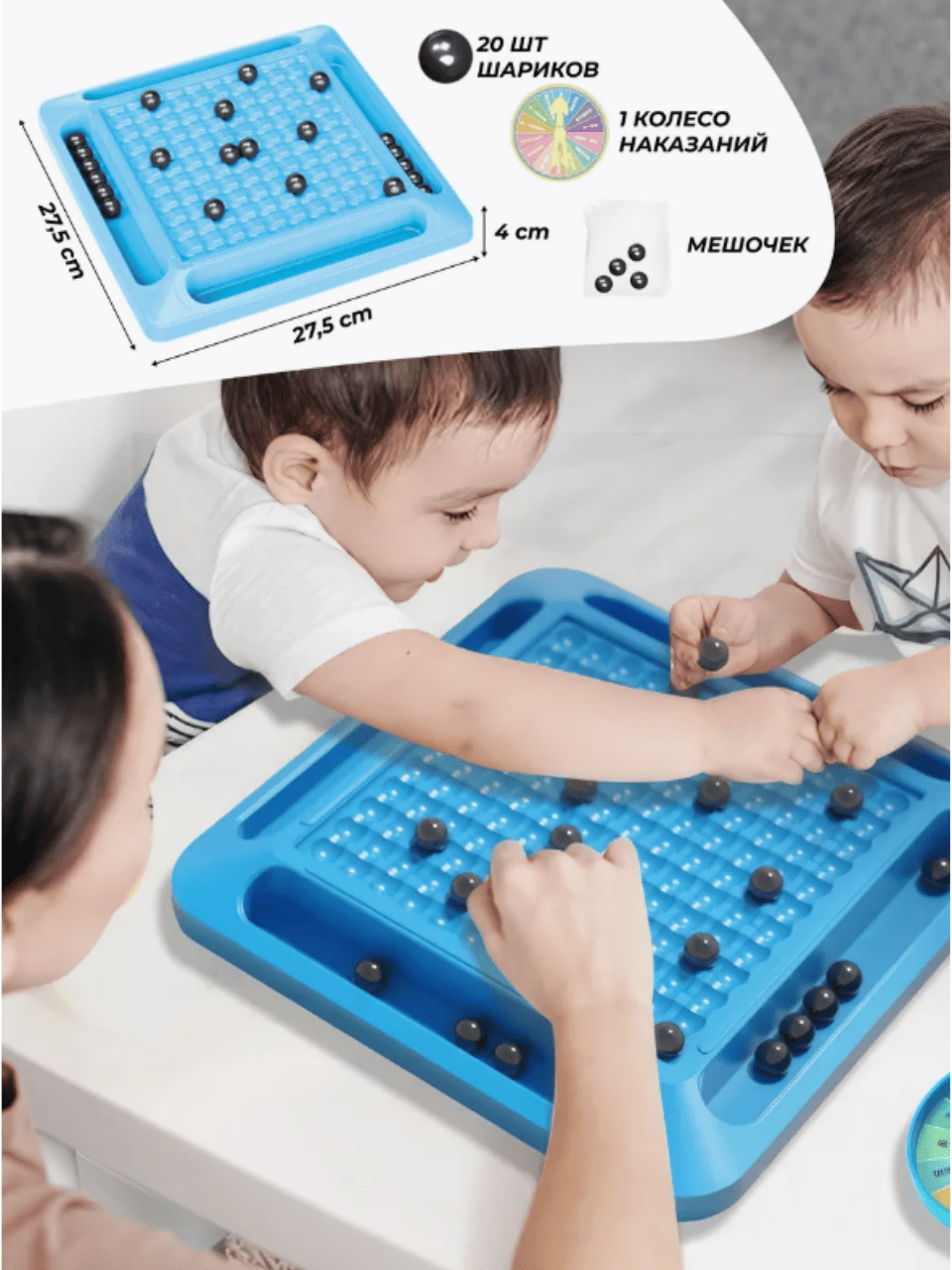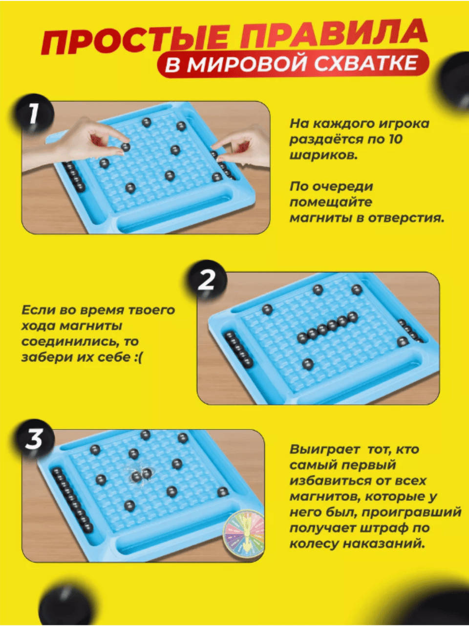 Настольная игра "Магнитный бой" - это увлекательное развлечение для всей семьи! Основными элементами игры являются магнитные шарики. Соберите свою команду и отправляйтесь в захватывающие сражения на игровом поле! Все магнитные шарики удобно хранятся в мешочке, что позволяет вам легко брать игру с собой в путешествия или куда-либо еще. Такая игра прекрасно подойдет как подарок на день рождения, 14 февраля, 23 февраля, 8 марта или любой другой праздник детям и взрослым, юношам и девушкам! Правила игры очень простые: -Каждый игрок берет по 10 шариков. -Шарики поочередно выкладываются на игровое поле так, чтобы расположенные рядом шарики не притянулись друг к другу. -Если шарики притянулись, то их забирает игрок, делавший ход. -Победит тот, у кого шарики закончатся первым. Игра Magnetic Battle Chess - это не только отличный способ провести время с друзьями или семьей, но также возможность развить логическое мышление и тактические навыки!