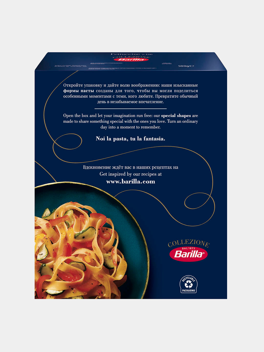Макароны Barilla «Феттуччине» – это плоские ленты шириной около 7 мм. Тесто замешивается по классическому итальянскому рецепту региона Эмилия-Романья, в его состав входят только высококачественная мука из твёрдых сортов пшеницы и очищенная вода. Форма макарон тонкая, плотная, слегка шероховатая и пористая. Такая лапша особенно удачно сочетается с густыми мясными соусами и помогает максимально полно раскрыть всё богатство их вкуса. В составе итальянской пасты нет искусственных красителей и других добавок. Гнёзда Barilla Fettuccine готовятся 6 минут, не развариваются и хорошо сохраняют форму.