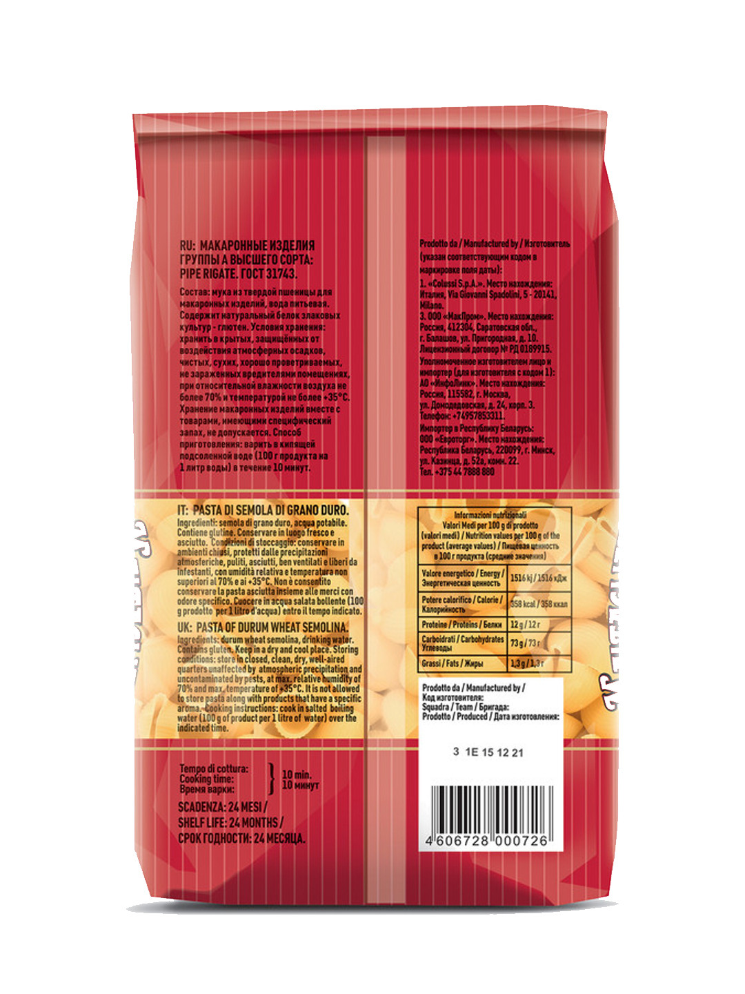 Maltagliati Pipe Rigate №096 — это паста из Италии, изготовленная из 100% твёрдой пшеницы (гранно дуре). Она отличается отличной текстурой и способностью удерживать соус благодаря своей характерной форме. Паста обладает классической итальянской текстурой с характерными бороздками, которые идеально захватывают соус, придавая блюду насыщенный вкус. Эти макароны идеально подходят для приготовления с различными соусами, включая соус на основе помидоров, мясные или овощные смеси.