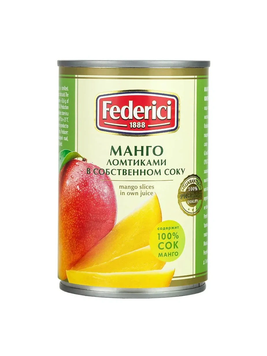Сочные ломтики манго в натуральном соку от бренда Federici. Без добавления сахара, с сохранением насыщенного вкуса и всех полезных свойств фрукта. Отличный выбор для десертов, выпечки, смузи и самостоятельного употребления.