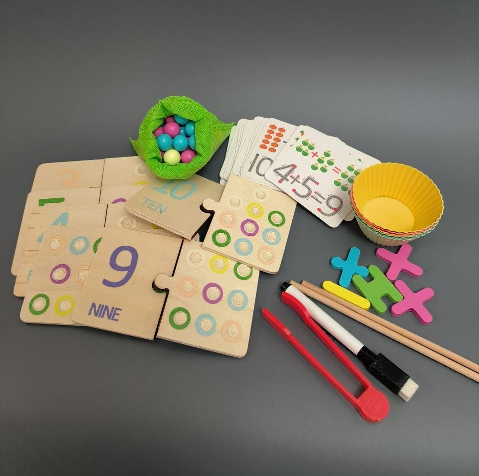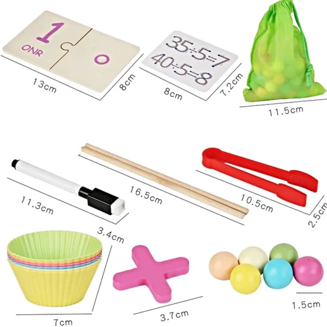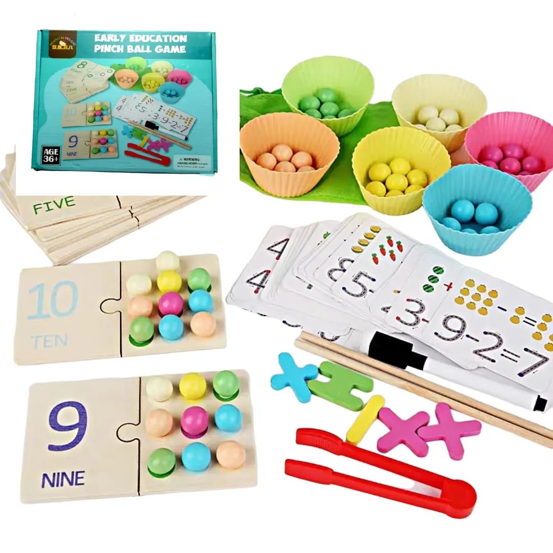 Дети могут использовать палочки для еды или щипцы, чтобы размещать шарики на доске в соответствии с номером, что развивает моторику, также есть карточки с математическими упражнениями, которые развивают математические способности детей.