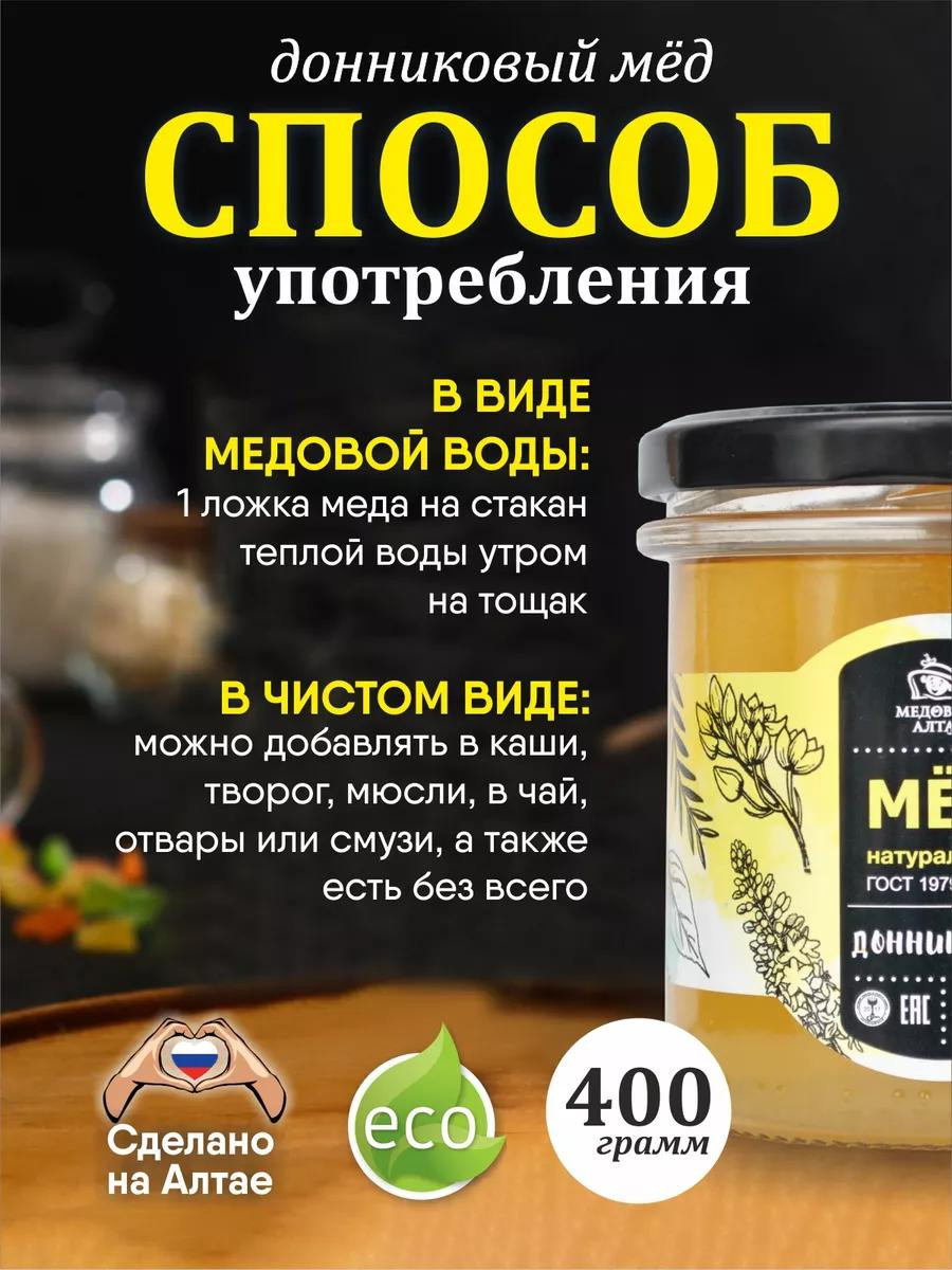 Дополнительная информация| Тип меда | донниковый; алтайский; натуральный |