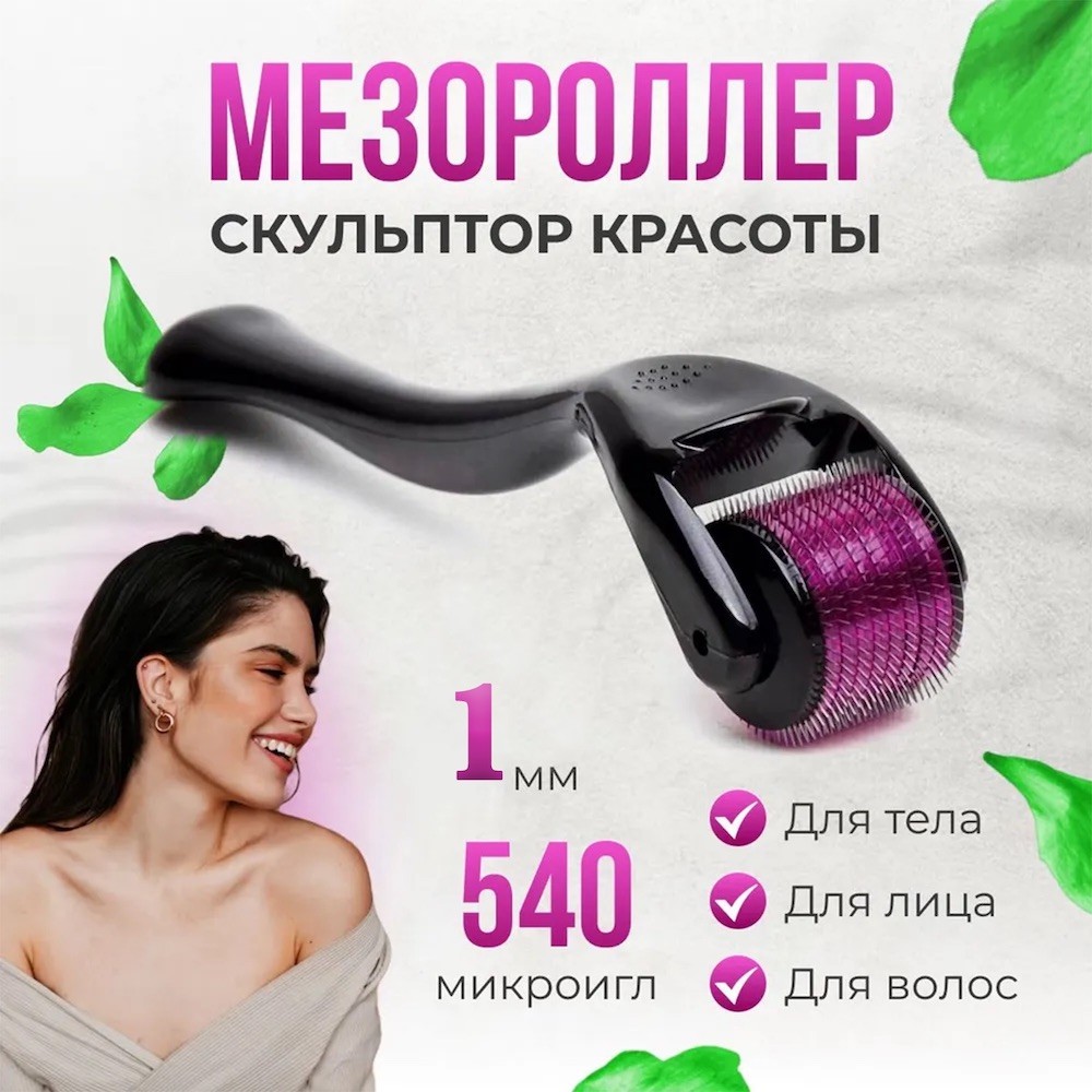 Мезороллер с иглами 1 мм из медицинской стали для омоложения и уменьшения размеров пор на лице и борьбы с растяжками и целлюлитом. Хороший способ для устранения морщин, улучшает выработку коллагена, эластина, уменьшает следы угревой сыпи, подтягивает овал лица. Мезороллер устраняет прыщи и предотвращается появление черных точек.