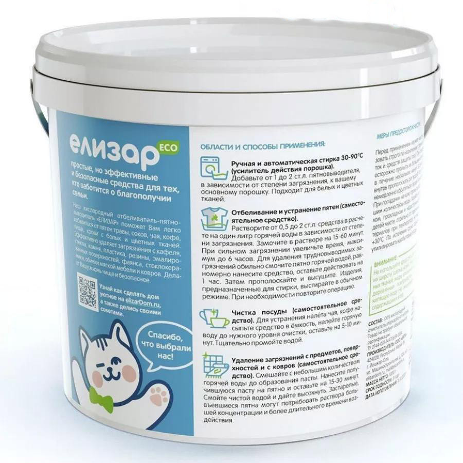 Елизар - мощный кислородный пятновыводитель, а также отличная активная добавка - усилитель действия любой бытовой химии для стирки. Средство не содержит хлора и фосфатов, используется как пятновыводитель для цветного белья, а также для стирки черного белья. Елизар применяется как отбеливатель для белого белья, удаляет желтизну и серость с белых вещей. Эффективно выводит застарелые и въевшиеся пятна органического происхождения: жирные пятна, пятна от пищи, от вина и любых напитков, от травы, одуванчиков, смолы, пятна крови, желтые пятна пота, пятна от йода, зеленки, марганцовки и пр. Кислородный пятновыводитель не предназначен для выведения пятен от красок (акварель, гуашь), чернил, косметики, ржавчины, технических жидкостей и прочей неорганики. Пятновыводитель Елизар - на 100% экологичная бытовая химия: в процессе реакции эко порошок распадается на соду, воду и активный кислород. Елизар - гипоаллергенный пятновыводитель для вещей аллергиков. Порошок безопасен для септиков. Елизар предназначен не только для стирки белья, но и для чистки кухонной утвари и посуды от въевшегося жира и нагара, пищевого налета: чайного, кофейного, после варки овощей. Елизар используется как средство для уборки дома: для чистки чистки ковров и напольных покрытий, плитки и межплиточных швов, для чистки мягкой мебели (обивки дивана, кресел, стульев), чистки матрасов (от пятен, разводов, запахов), для удаления плесени. Кислородный пятновыводитель Елизар подходит для чистки ювелирных изделий (золото и серебро, без камней) от налета и от потемнения. Елизар - чистящее средство для уборки и дезинфекции, удаляет сильные запахи. Важно! Для активации средства необходима максимально горячая вода. Состав: более 30% (95%) активная добавка, < 5% ТАЕД (Биоразлагаемый активатор), < 5% гидрокарбонат натрия.