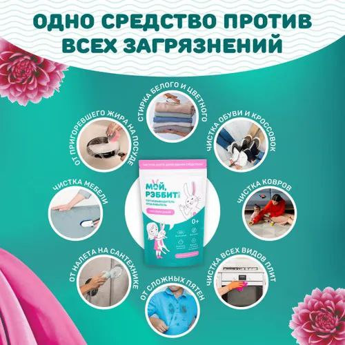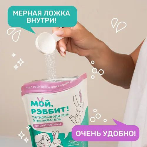 Кислородный отбеливатель-пятновыводитель “Мой, Рэббит!” удаляет любые загрязнения органического происхождения: пятна от травы и земли, напитков и пищевых продуктов, жира и крови. Безопасен для белых и цветных тканей, для дома, для детской одежды. Средство универсальное, поэтому можете использовать его для уборки всего дома. Кислородный очиститель эффективно удаляет пятна с одежды, посуды, кухонных принадлежностей, полотенец, сковородок, кастрюль, ванной комнаты, душа, туалета, мебели, ковров, обуви и еще более 30 способов применения. Пятновыводитель абсолютно безопасен для всех - в его составе нет хлора. Подходит для белых и цветных тканей. Отмывает, очищает и отстирывает: Раковины, сантехнику, кастрюли, сковородки, чайники, столовые приборы, френч-прессы, термосы, мультиварки и микроволновки, формы для запекания, шампура, решетки для гриля, кухонные вытяжки, серебряные украшения, мебель, ковры, одежду, скатерти, полотенца. Порошок "Мой, Рэббит!" разбавляется кипятком и этот раствор удаляет любые загрязнения без усилий за счёт активного кислорода. Достаточно положить вещь в горячий раствор и грязь отойдёт сама или можно протереть поверхность тряпочкой, смоченной в растворе.