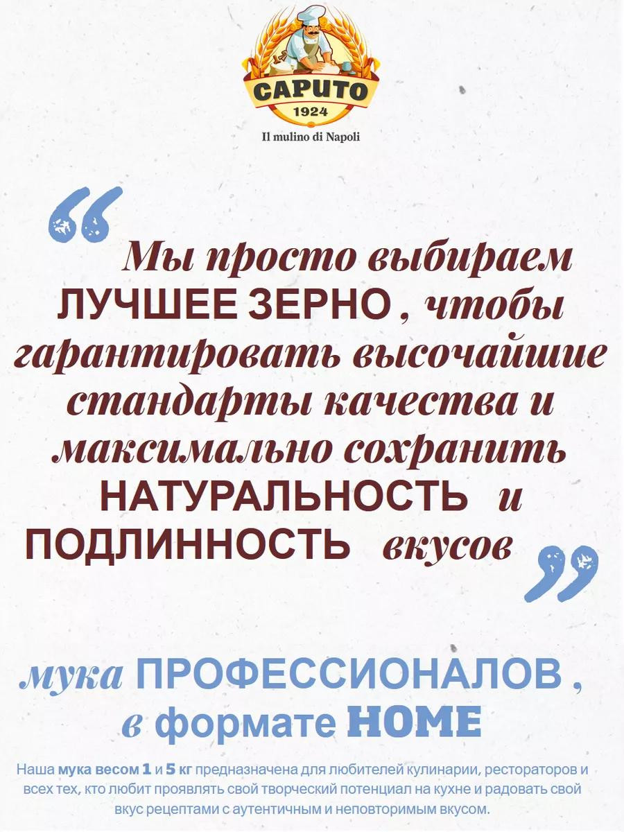 Мука пшеничная из мягких сортов пшеницы Куоко тип "00" 1 кг для пиццы, универсальная Antimo Caputo (Капуто), Кампания (Неаполь), Италия, W 300-320.Мука произведена из тщательно отобранных сортов пшеницы чтоб стать идеальной базой для традиционной неаполетанской пиццы. Увеличение количества глютэна высочайшего качества позволяет получить всегда отменное тесто, стабильное и эластичное. Кроме того тщательнейшие исследования и разработки специалистов Капуто позволят Вам всегда получать идеальный конечный продукт с уникальным и традиционным вкусом. Универсальна! Идеальна для любых видов выпечки: кондитерских изделий, хлеба, пиццы, всевозможных пирогов и пирожных, особо рекомендуется для приготовления выпечки и кондитерских изделий с длительным периодом левитации. Готовое тесто из этой муки, благодаря повышенному фактору WW (содержанию клейковины), при хранении в холодильнике, сохраняет эластичность и идеально для работы на протяжении 24 часов с момента замеса.