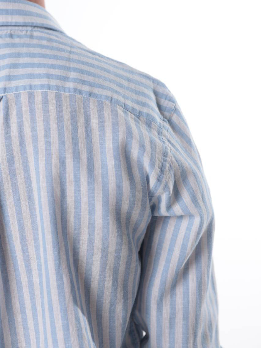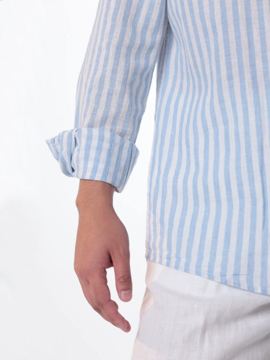 Мужская рубашка из натурального льна голубая в полоску — идеальный выбор для жаркой погоды. Лёгкая, дышащая ткань обеспечивает комфорт и ощущение прохлады даже в самый тёплый день.
