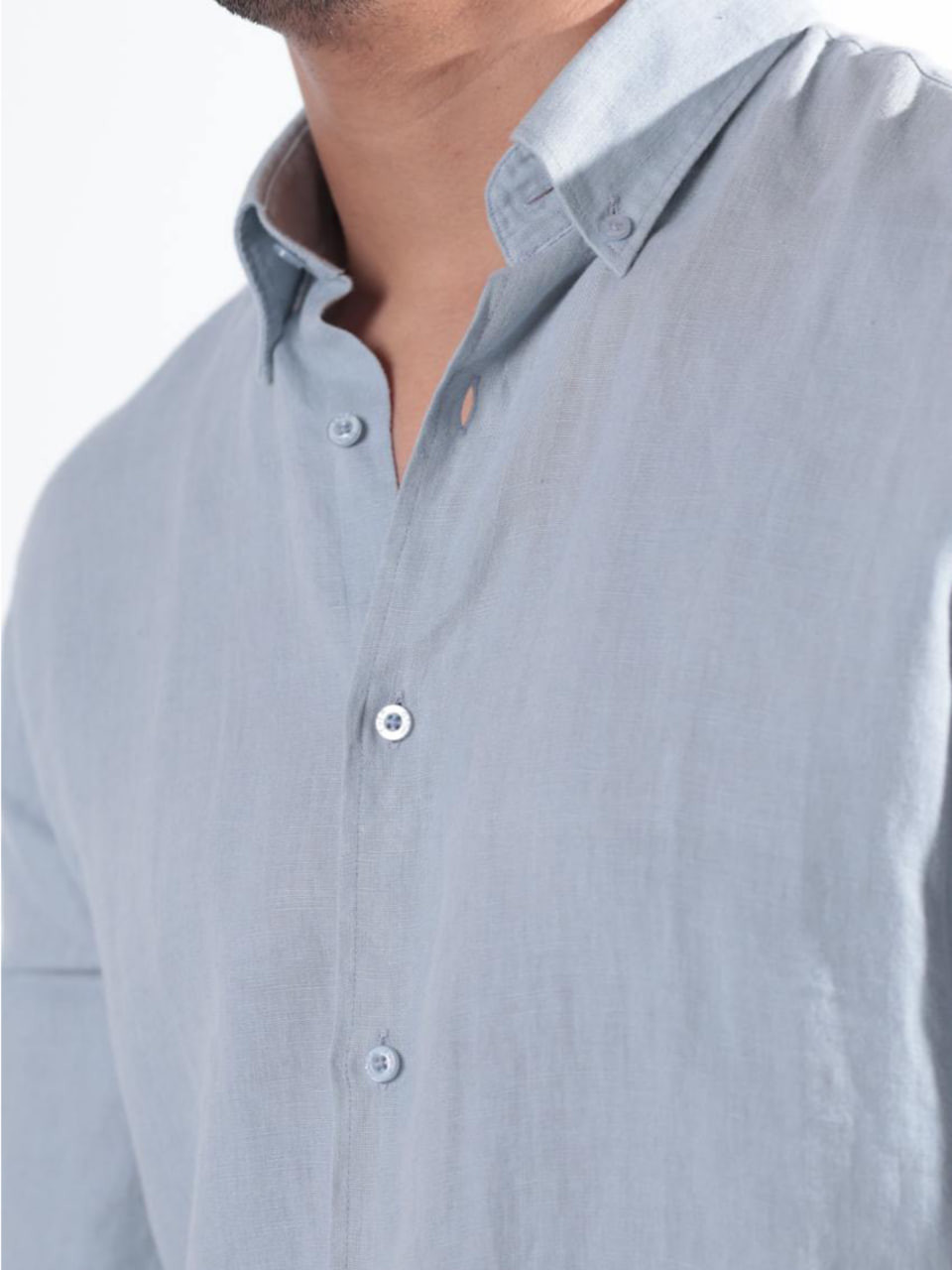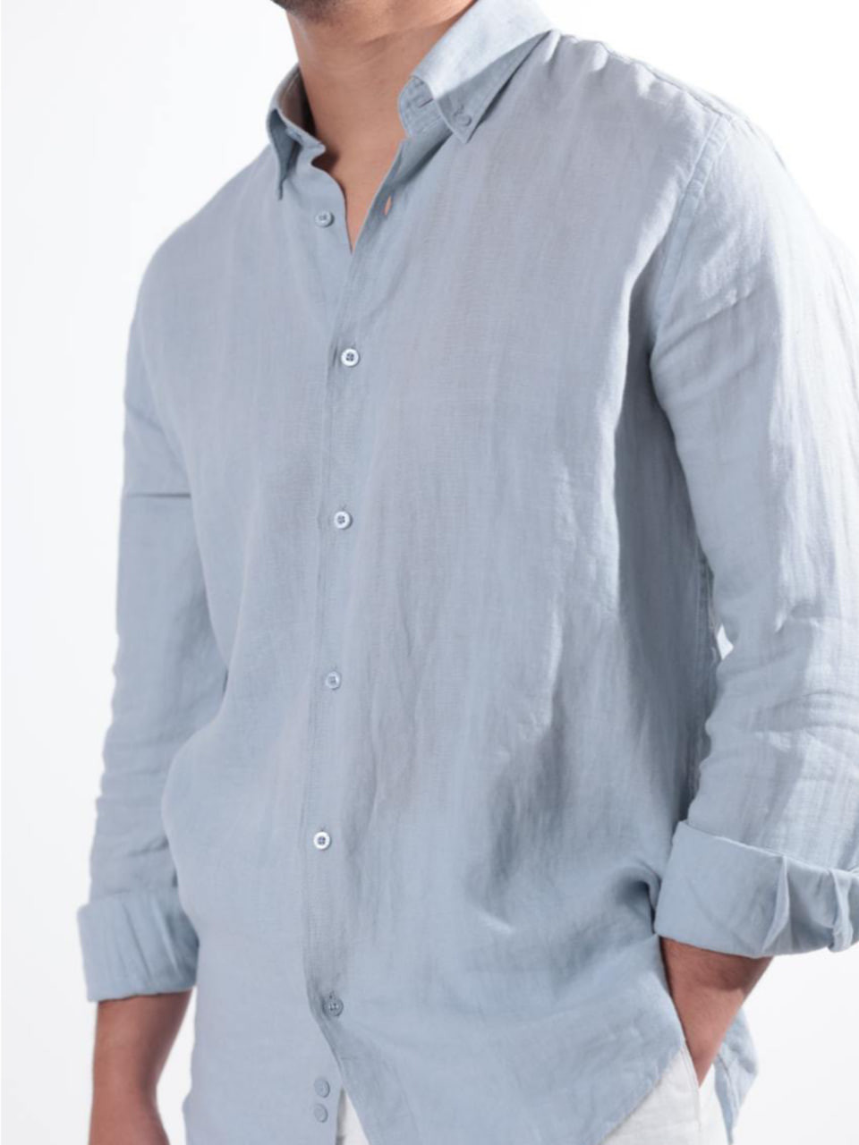 Небесно-голубая мужская рубашка из натурального льна — идеальный выбор для жаркой погоды. Лёгкая, дышащая ткань обеспечивает комфорт и ощущение прохлады даже в самый тёплый день.