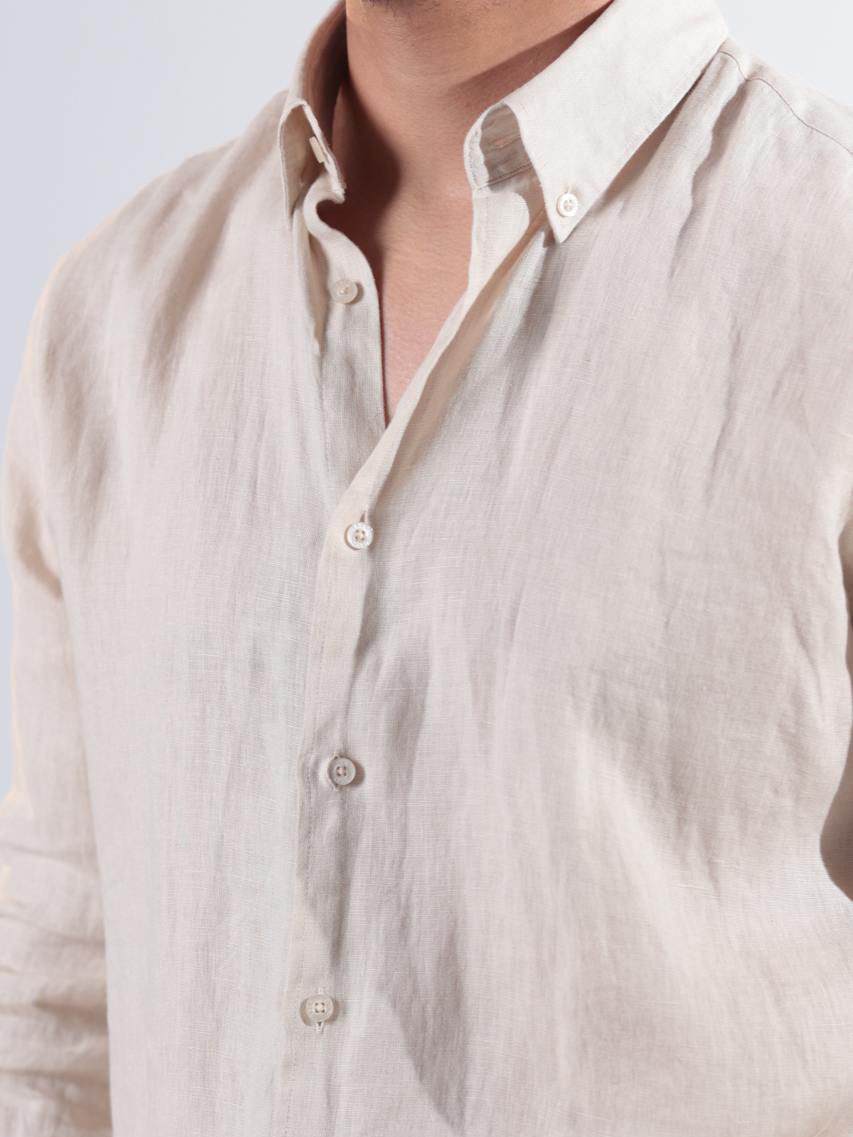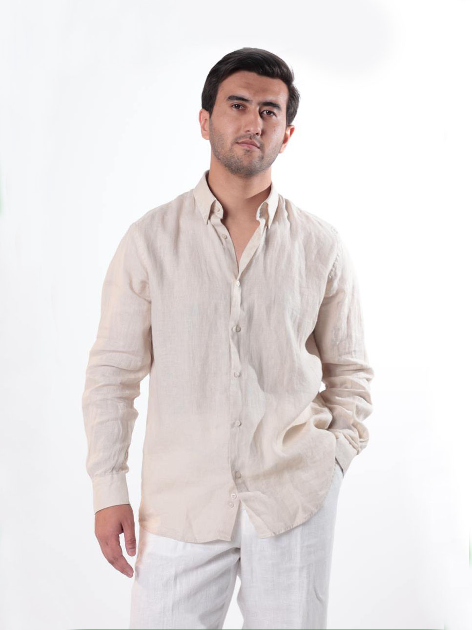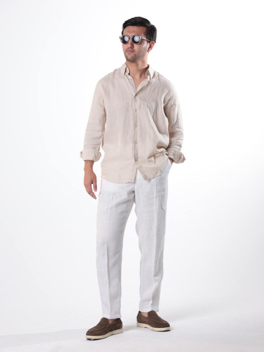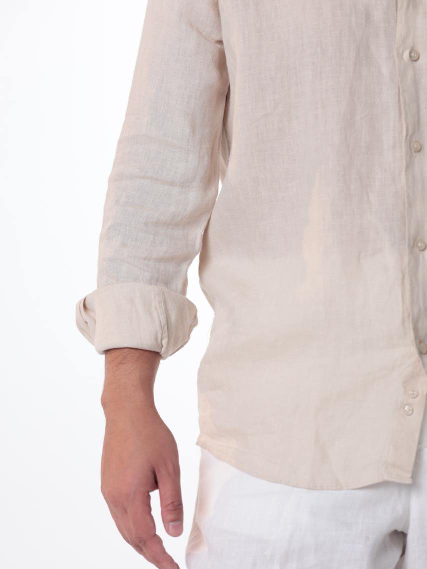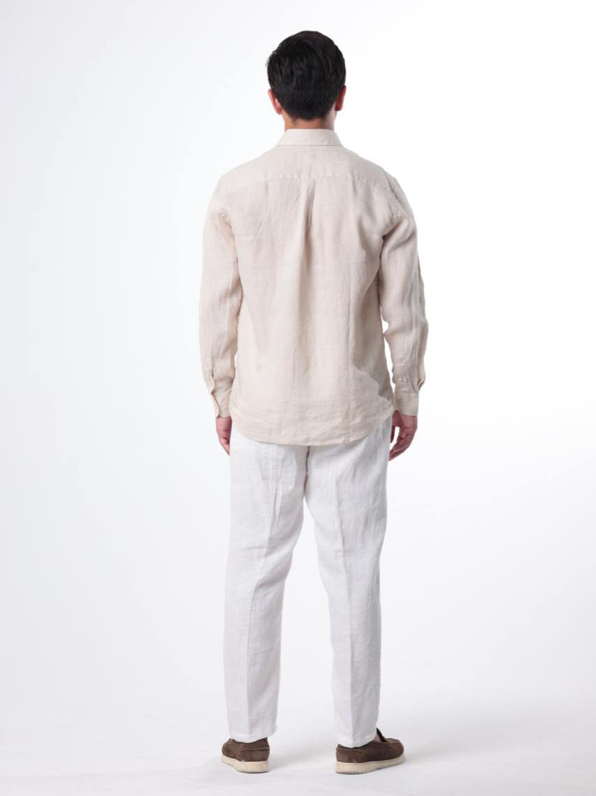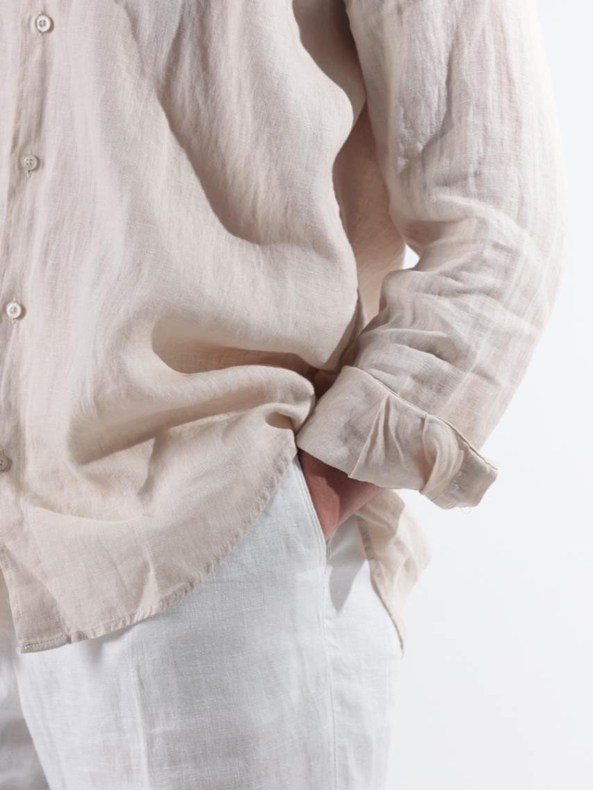 Мужская рубашка из натурального льна цвета слоновой кости — идеальный выбор для жаркой погоды. Лёгкая, дышащая ткань обеспечивает комфорт и ощущение прохлады даже в самый тёплый день.