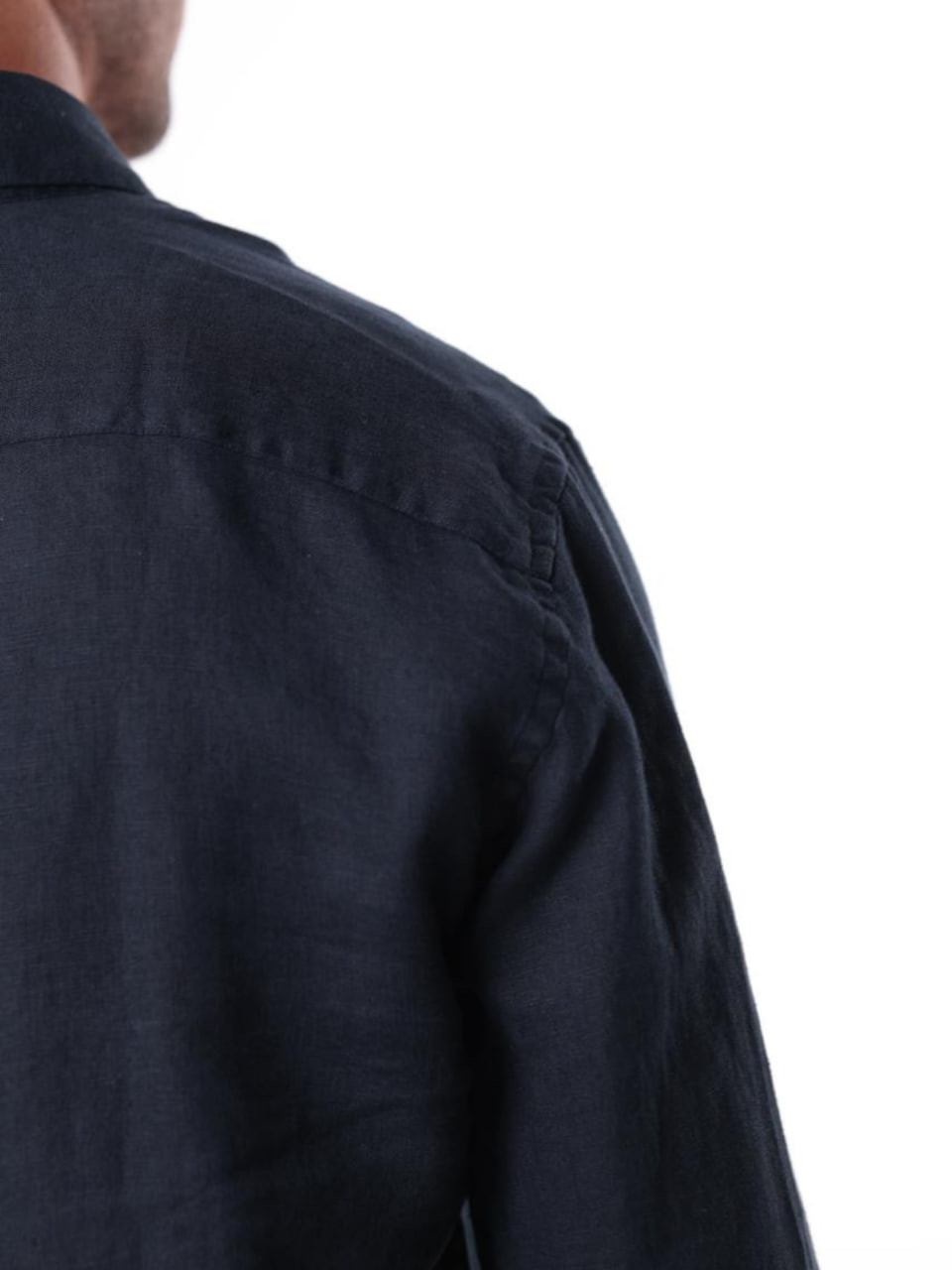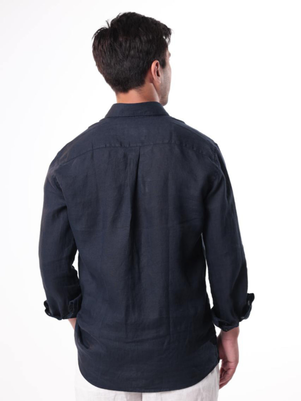 Тёмно-синяя мужская рубашка из натурального льна — идеальный выбор для жаркой погоды. Лёгкая, дышащая ткань обеспечивает комфорт и ощущение прохлады даже в самый тёплый день.