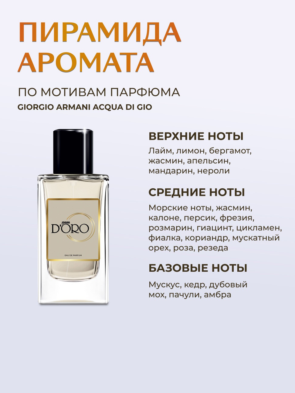 Освежающий и легкий мужской аромат, созданный по мотивам культового Giorgio Armani Acqua di Gio. Эта парфюмерная композиция сочетает в себе морскую свежесть, цитрусовую энергию и древесную глубину, создавая ощущение свободы и естественной элегантности. Верхние ноты раскрываются бодрящими аккордами бергамота, лайма и морской воды. В сердце аромата переплетаются легкие цветочные оттенки жасмина и розмарина, а базовые ноты мускуса, кедра и амбры придают стойкость и теплоту.