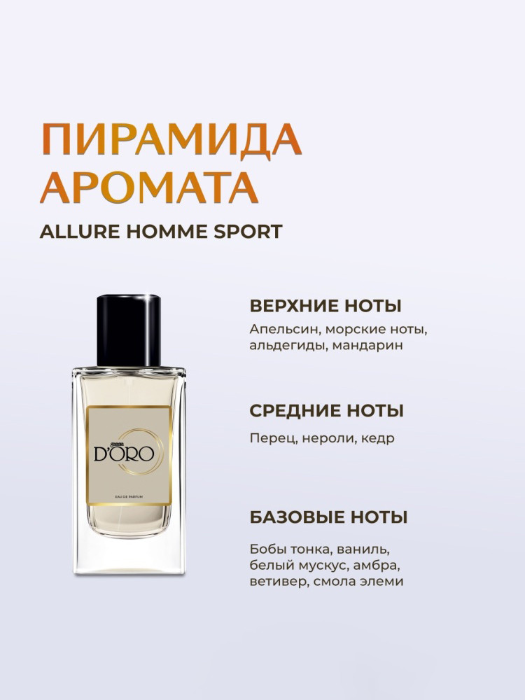 D'ORO MEN — это сочетание свежести цитрусов, бодрящих морских нот и теплых древесных аккордов. Этот аромат идеально подойдет для энергичных мужчин, ведущих активный образ жизни, которые ценят элегантность и легкость в каждой детали.
