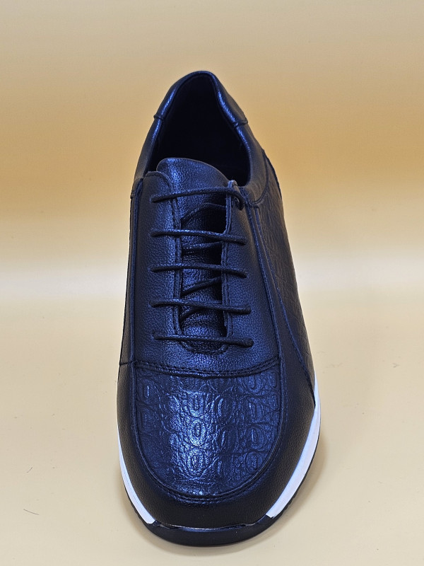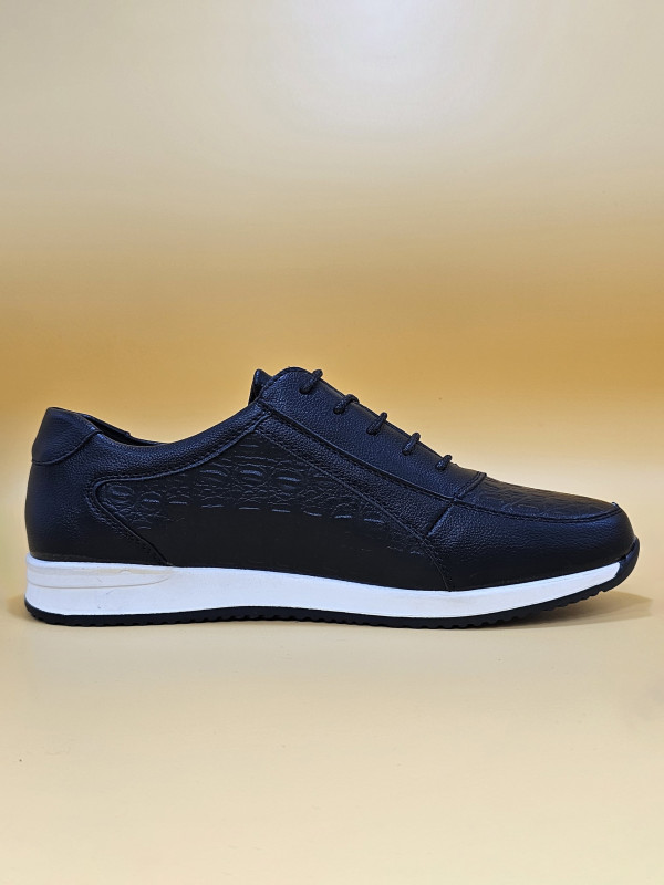 Добавьте стиль в повседневный образ с этими премиальными мужскими кожаными кроссовками, созданными для комфорта и долговечности. Элегантный черный дизайн с тонким тиснением под крокодиловую кожу на верхней части придает классической модели утонченный вид.