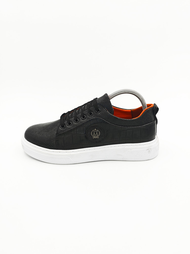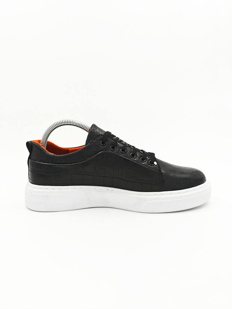 Эти стильные черные кроссовки – идеальный выбор для тех, кто ценит сочетание модного дизайна и удобства. Верх из эко-кожи с тиснением под крокодиловую кожу придает обуви элегантный и дорогой вид, а внутренняя оранжевая подкладка добавляет контрастности и уникальности.