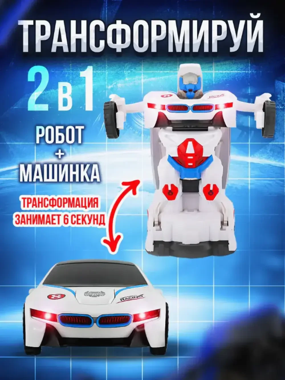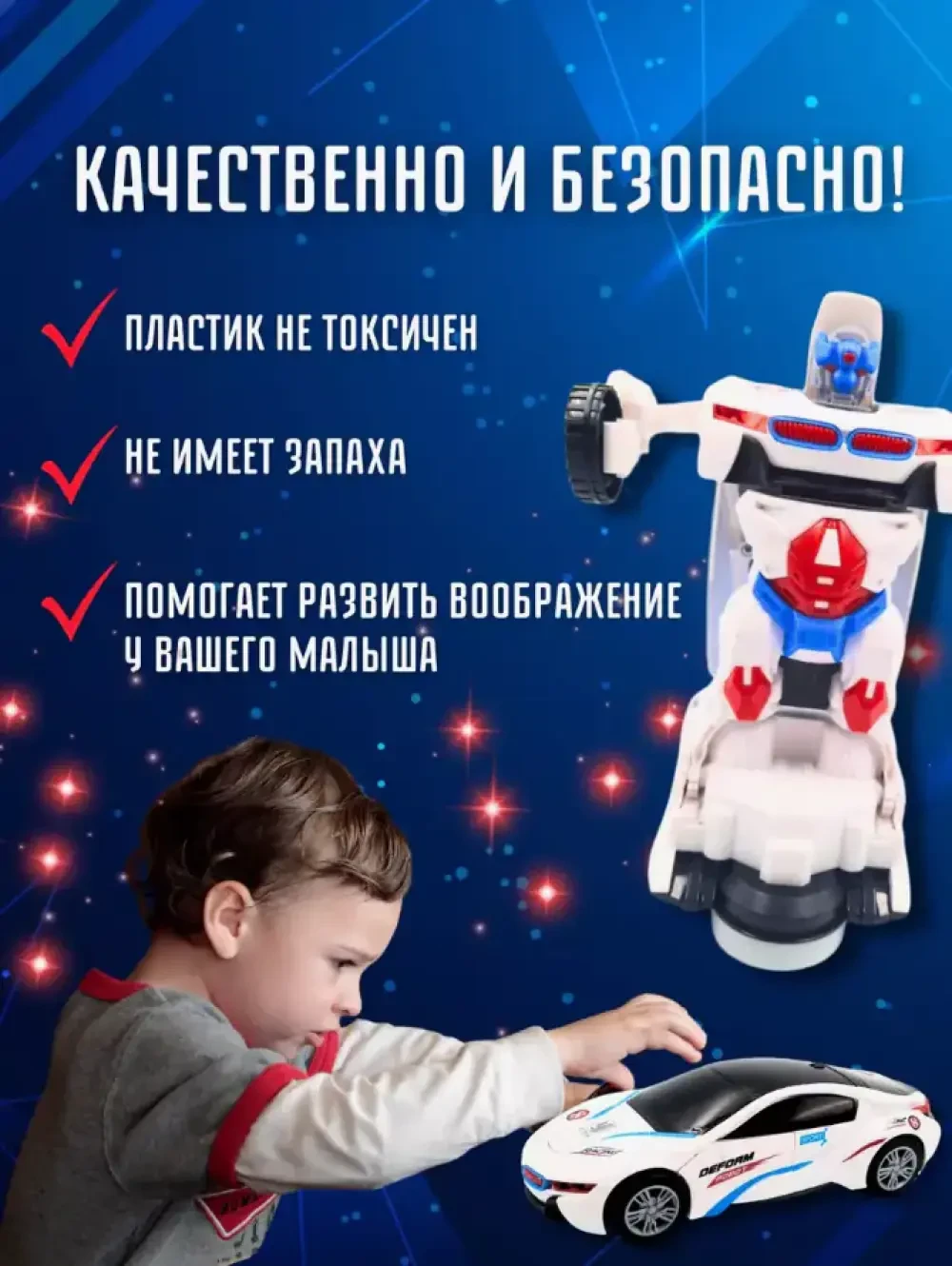 Робот-трансформер машинка Deform Robot. Новинка! Такая игрушка станет отличным подарком на любой праздник. С ней можно играть в различные сюжетно-ролевые игры, которые помогают детям освоить новые социальные роли и развить воображение. А ещё во время управления машинкой при выполнении манёвров развиваются ловкость и координация движений. Деформ-робот - робот-трансформер, при превращении светится красным и синим светом и проигрывает веселую музыку, ездит во всех направлениях и умеет объезжать препятствия! Развивает мозг ребенка, прививает ему любопытство и тягу к знаниям. Работает от 3 батареек типа АА, в комплект не входят. Перед применением нужно снять блокировку с колес. После активации включается подсветка, и игрушка самостоятельно перемещается по комнате под музыку, трансформируясь и объезжая препятствия. Поторопись! Последний день скидок!
