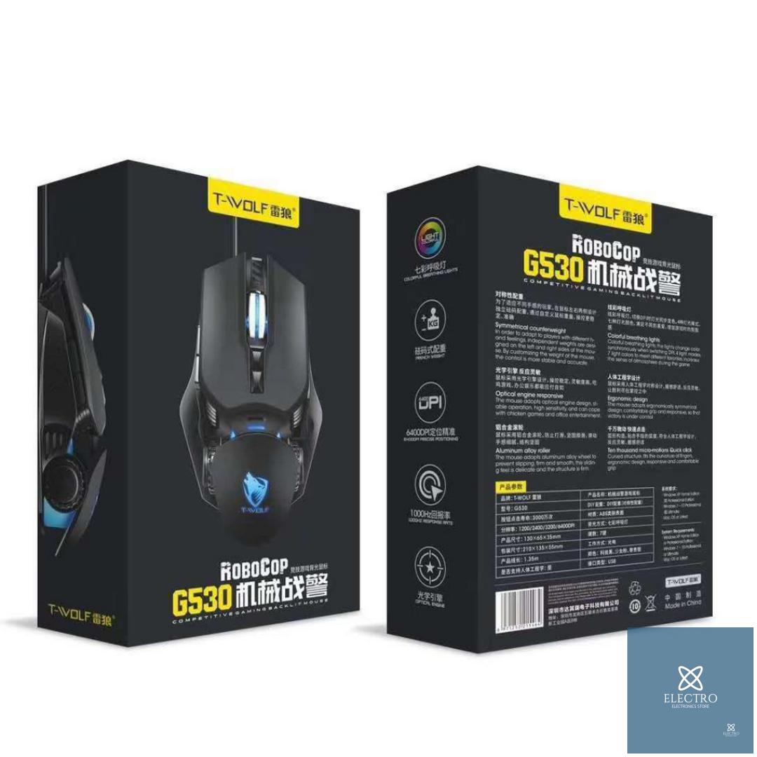 T-Wolf G530 – качественная проводная геймерская мышь с современным дизайном, обладая высокими значениями DPI и программируемыми кнопками. Дизайн у мышки современный и геймерский, в корпусе также имеется встроенная LED-подсветка, которая добавляет ей стиля, также на корпусе помимо стандартных кнопок мышки расположены дополнительные программируемые кнопки, позволяющие назначать на них любые необходимые действия. Корпус мышки изготовлен из качественного ударопрочного пластика, защищающего мышь от повреждений при ударах и падениях. Данная мышь обладает переключаемым DPI со значениями от 1200 до 6400, значения эти меняются на ходу посредством специальной кнопки, происходит это легко и быстро. Подключается мышь посредством USB-кабеля длинной в 1,5м, которой хватит для комфортного размещения, кабель защищен надежным полимерным покрытием, оберегающим его от перегибов и заламываний.