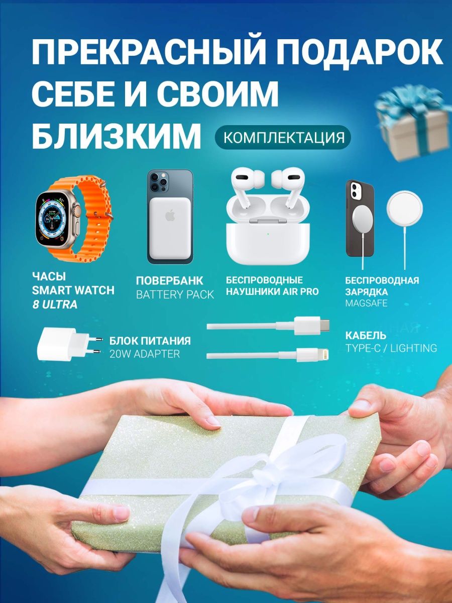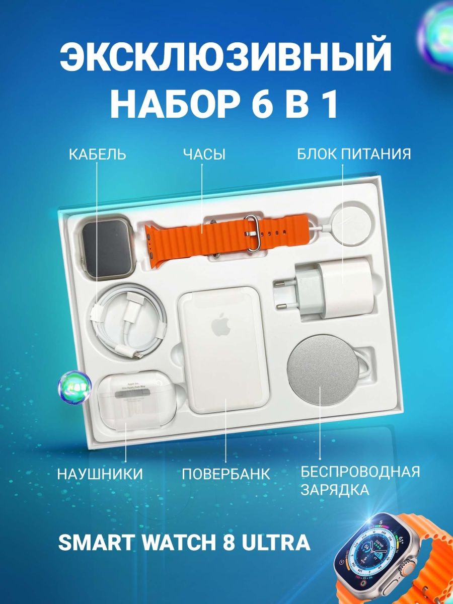 Представляем вам набор 6 в 1 UNIQUE COMBINATION - идеальное сочетание аксессуаров для Apple устройств. Включает в себя самые передовые технологии и функции, чтобы удовлетворить все ваши потребности.В состав набора 6 в 1 входят смарт-часы Apple Watch, которые стали настоящим феноменом в мире гаджетов. Они не только отображают уведомления из социальных сетей, но и позволяют совершать и принимать звонки, учитывать шаги, мониторить сон, управлять календарем и даже считать калории. Невероятно удобные и стильные, они подойдут как для мужчин, так и для женщин, а также для детей.Набор также включает в себя беспроводные наушники нового поколения - AirPods Pro. Они обеспечивают потрясающее качество звука и активное шумоподавление, чтобы вы могли наслаждаться музыкой полностью погружаясь в ее мир. Благодаря своему удобному дизайну и безпроводной технологии, эти наушники станут вашим незаменимым спутником в любых ситуациях.Зарядные устройства также входят в наш набор. Беспроводное зарядное устройство и внешний безпроводной аккумулятор повербанк обеспечат вам дополнительную энергию и возможность заряжать ваши устройства в любое время и в любом месте. Быстрое зарядное устройство 20 W и кабель для зарядки позволят вам зарядить ваши устройства быстрее и надежнее.Покупая набор 6 в 1, вы экономите время и деньги, так как все необходимые аксессуары уже собраны в одном месте. Вы получаете полный набор для использования вашего Apple устройства на все 100%.Этот набор идеально подходит для активных людей, которые ценят свое время и стремятся быть всегда на шаг впереди. Смарт-часы мужские идеально подчеркнут ваш стиль и дадут вам возможность быть в курсе всех событий. Смарт-часы женские добавят вашему образу нотку изящества и элегантности, а также будут полезным аксессуаром в вашем ежедневном режиме. Смарт-часы детские порадуют ваших детей своим ярким дизайном и множеством функций, которые помогут им быть активными и заботливыми о своем здоровье.