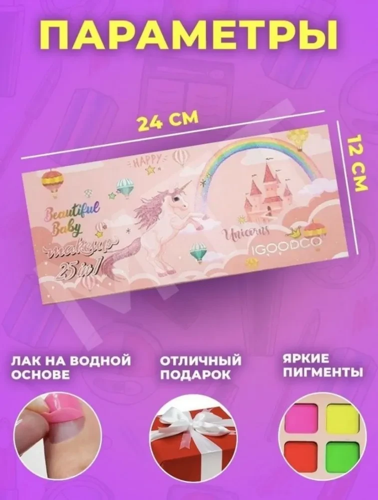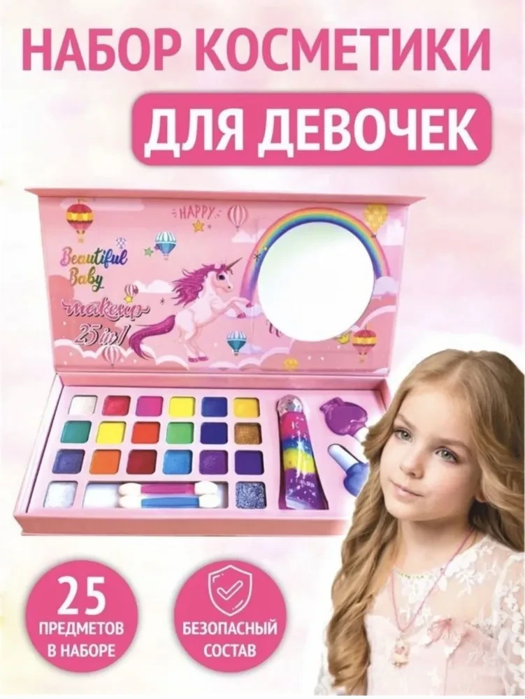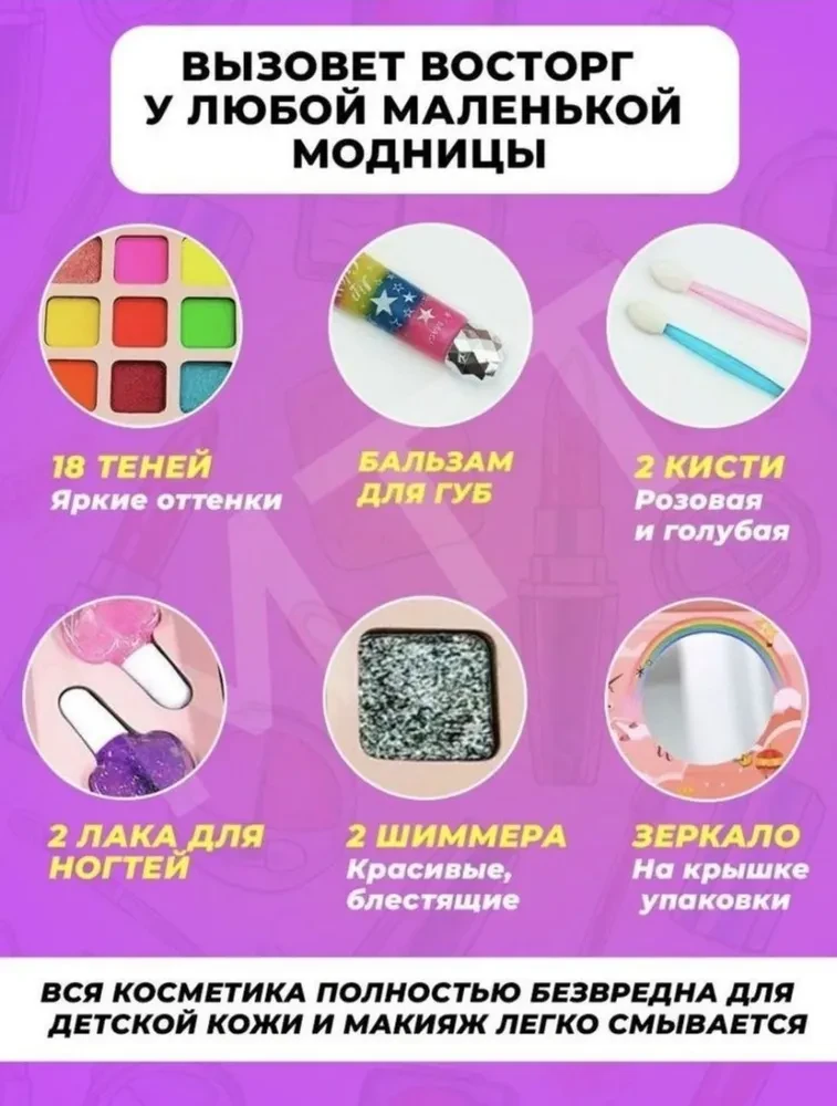 Детская косметика - это настоящая декоративная косметика, как у мамы, разработанная специально для детей. Подарочный набор детской косметики для девочек поможет маленькой принцессе воплотить свои мечты и фантазии. При этом мамина косметика не пострадает. Легко смывается теплой водой, поэтому можно смело экспериментировать с макияжем. В набор входит: Блеск для губ - 1 шт; тени для век - 18 цветов; лак для ногтей на водной основе - 2 шт; кисти-спонж для нанесения макияжа - 2 шт; тени для век блестящие (глиттер)- 2 шт; зеркальце. Состав косметики невероятно качественный и гипоаллергенный. Подходит для детей от 3-х лет. Такой набор станет мечтой для вашей девочки, ведь с ним она научиться пользоваться косметикой, экспериментировать различные образы, развивая чувство собственного стиля, мелкую моторику рук, мышление и фантазию. Порадуйте своего ребенка таким прекрасным и занимательным подарком, как набор детской декоративной косметики , и он обязательно останется довольным. Детская гипоаллергенная косметика в подарочном в стиле для творчества - это лучший подарок для девочек, дочке, подруге, сестре, любимой внучке в День Рождения, 8 Марта, 1 сентября, Новый год и порадовать ребенка без повода. Подарите настоящие эмоции своим принцессам!