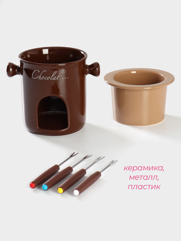 Особенности: Набор идеально подходит для приготовления шоколадного или сырного фондю. Прост в использовании — достаточно подогреть шоколад или сыр в чашке, а затем использовать шпажки для погружения фруктов, хлеба или других ингредиентов.