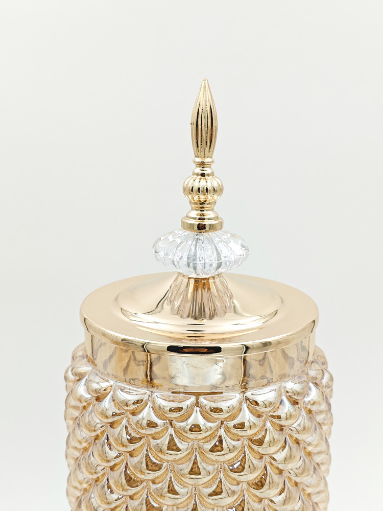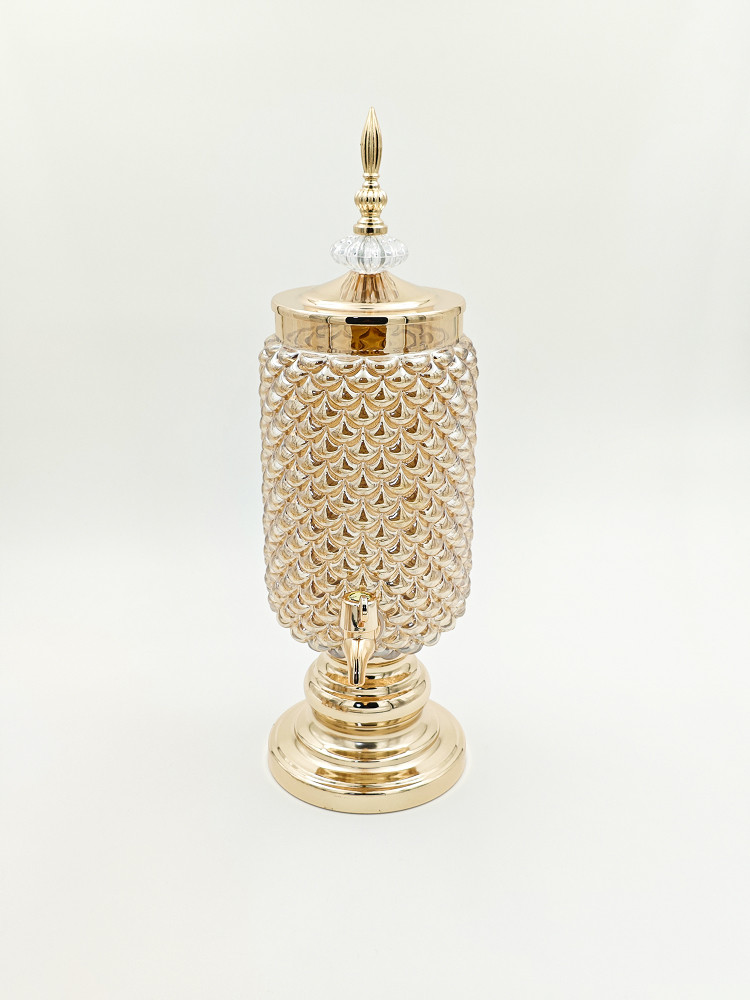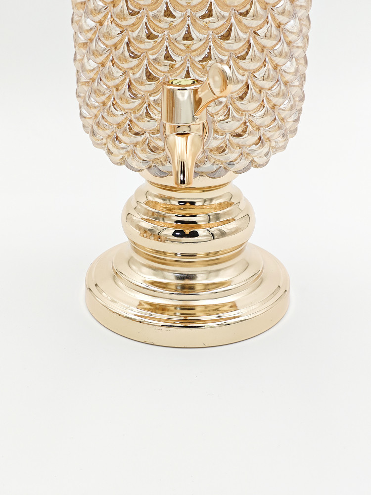 Эксклюзивный набор для напитков из качественного стекла с роскошной золотистой отделкой, выполненный в оригинальном дизайне с фактурой, напоминающей ананас. В комплект входит большой стеклянный диспенсер с краном и декоративной крышкой, а также набор из 6 изящных стаканов. Набор идеально подходит для подачи прохладительных напитков, коктейлей и лимонадов на праздничных мероприятиях и торжественных приемах.