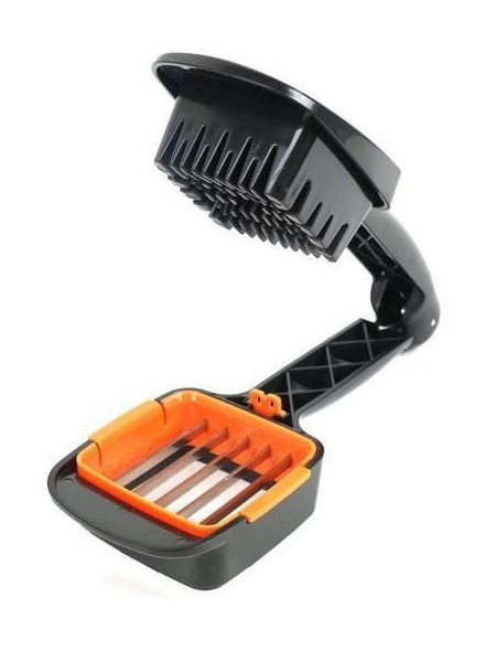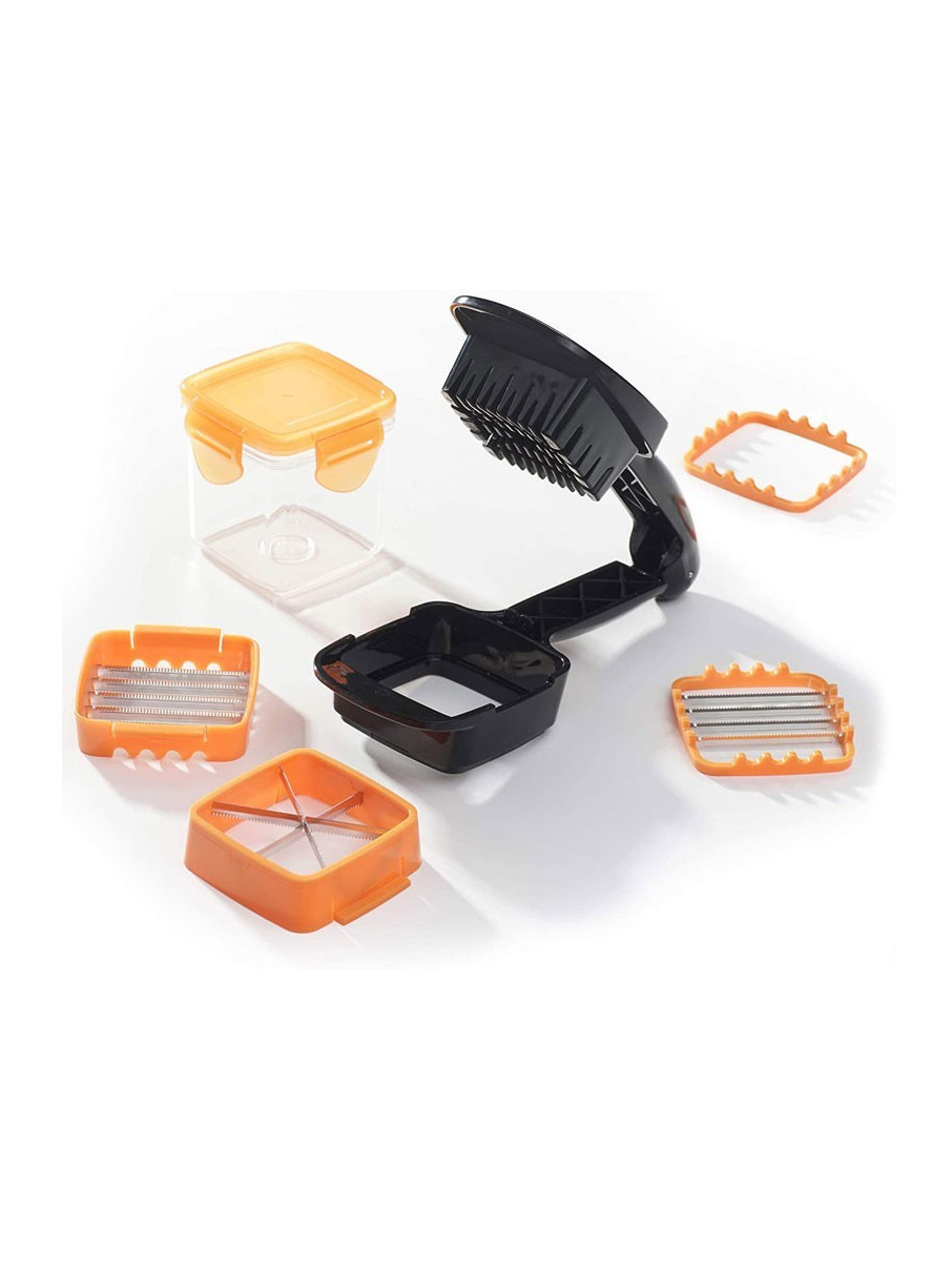 Этот компактный овощерезка-пресс объединяет пять типов нарезки в одном устройстве – от мелких кубиков для салатов до соломки для жарки и супов. Просто установите нужную насадку, поместите овощ в прижимную рамку и нажмите ручку – готовая нарезка окажется в прозрачном контейнере. Эргономичная форма и надёжный замок-флажок обеспечивают ровный срез без риска задеть пальцы.
