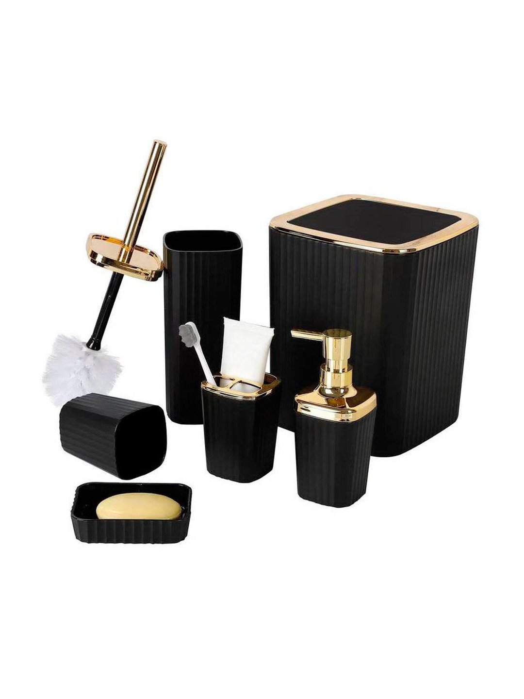 1. Дозатор для жидкого мыла или геля для душа. 2. Ёрш для уборки унитаза. 3. Держатель для зубных щеток. 4. Питьевой стаканчик. 5. Мыльница для твердого мыла. 6. Ведро.