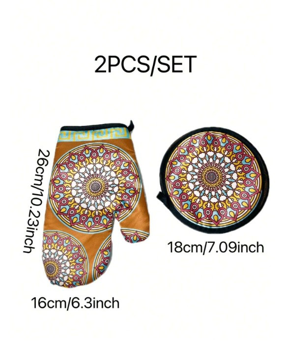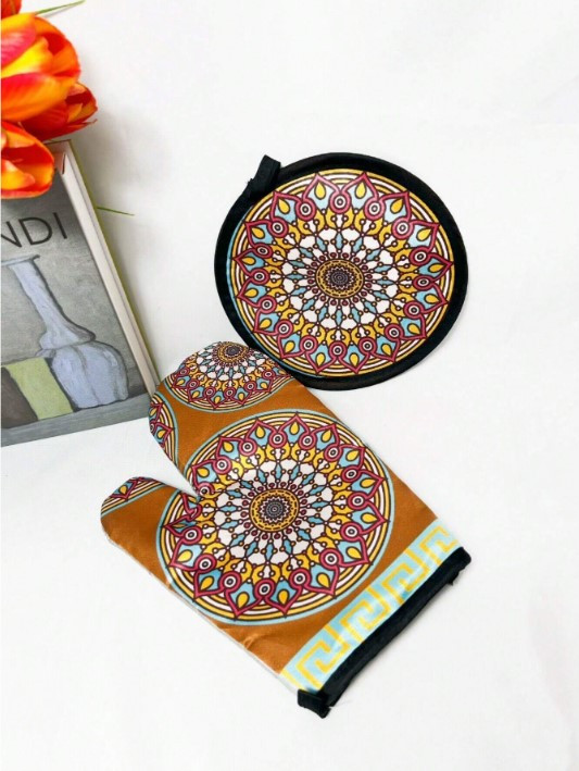 Эффектный кухонный набор, состоящий из прихватки и варежки, украшен ярким этническим узором в восточном стиле. Симметричный дизайн с мандалой создает яркий акцент в интерьере кухни, добавляя уюта и колорита. Прихватка круглой формы и варежка выполнены из прочного и термостойкого материала, обеспечивающего надежную защиту от высоких температур. Идеально подходит для использования при готовке, выпечке или сервировке горячих блюд. Такой набор станет не только практичным, но и стильным подарком.