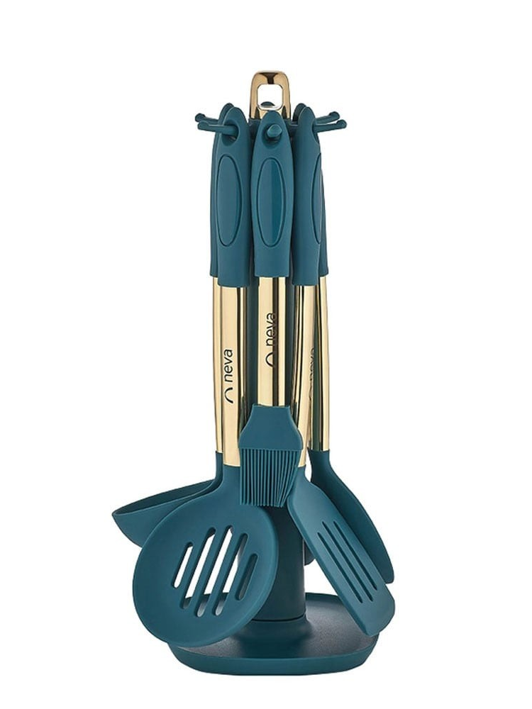 Включает: поварешку, ложку для спагетти, шумовку, лопатку, ложку, кисточку и подставку.