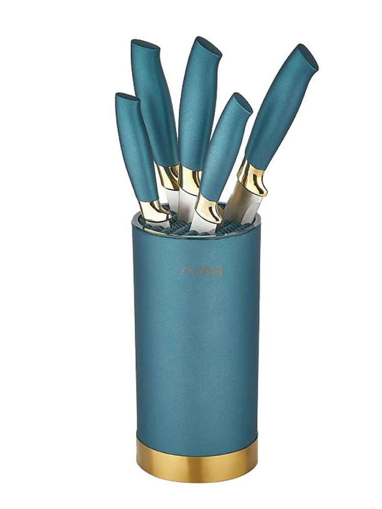 Содержит: нож шефа, нож для хлеба, нож для нарезки, универсальный нож, нож для чистки и подставку.
