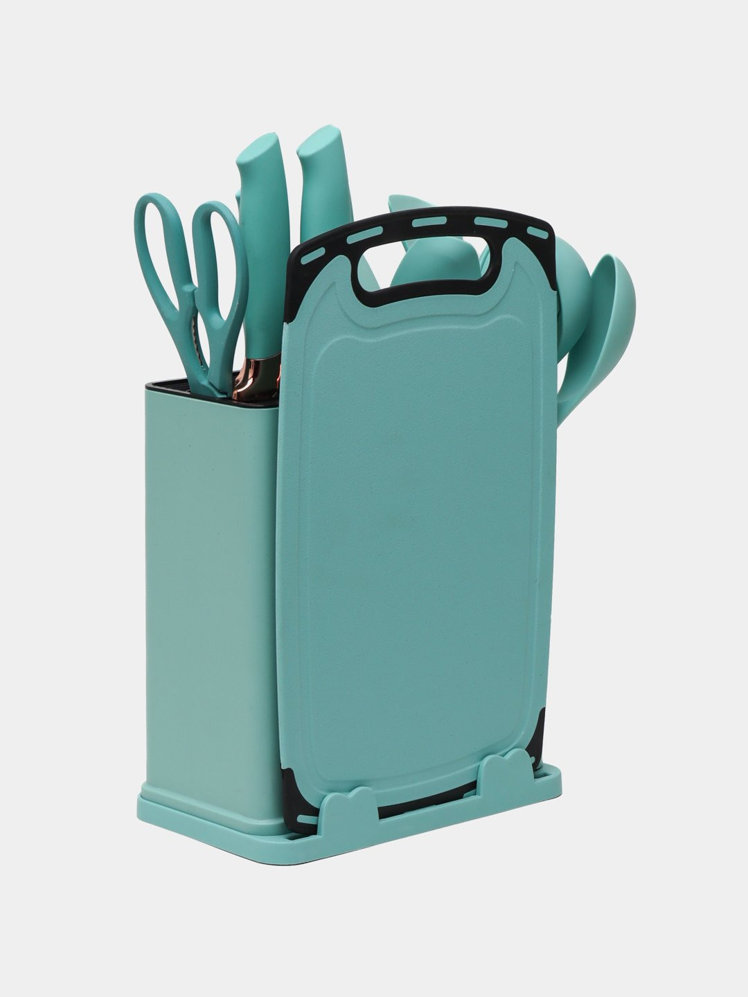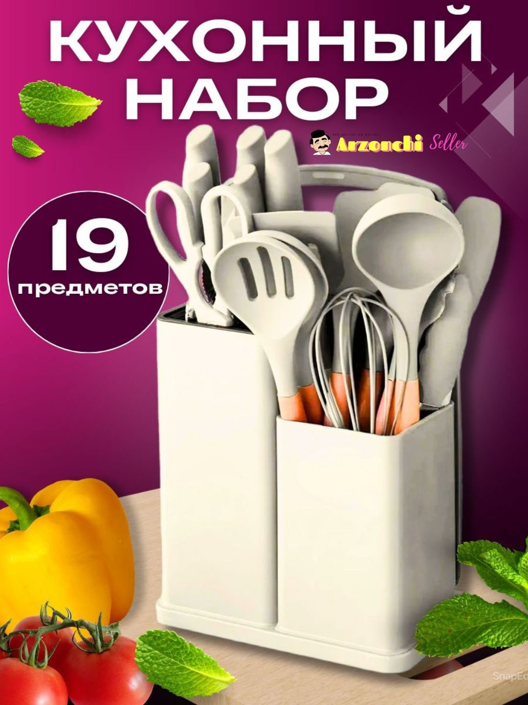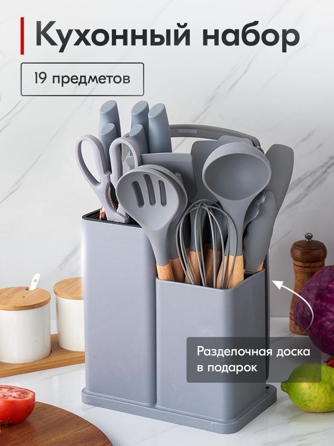 Этот стильный и функциональный кухонный набор из 19 предметов — идеальный помощник для любой хозяйки. В комплекте вы найдете всё необходимое для комфортного приготовления блюд: ножи из нержавеющей стали, кухонные лопатки, венчик, щипцы, ножницы и даже разделочную доску! Эргономичный дизайн, прочные материалы и универсальность делают этот набор отличным выбором для вашей кухни.