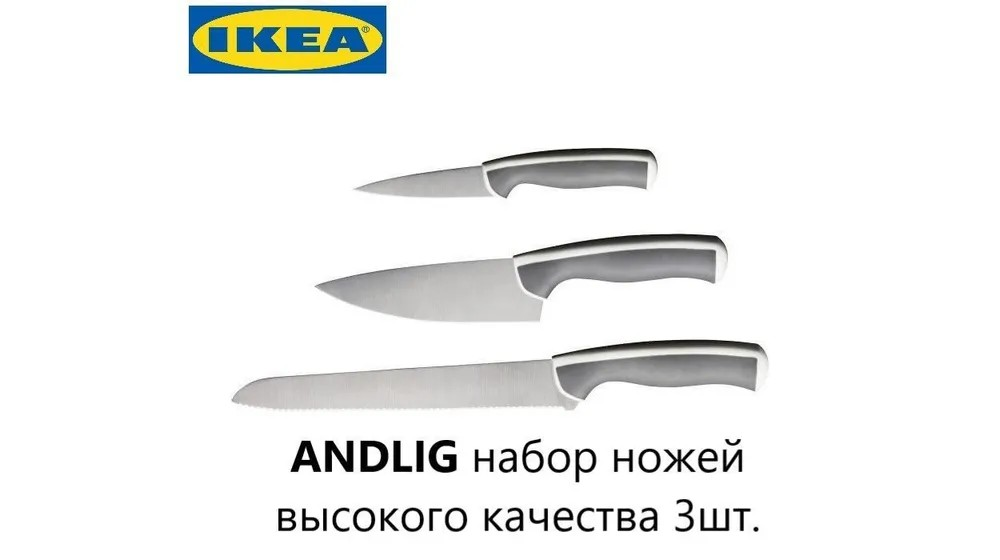 Представляем вам набор ножей ANDLIG от популярного бренда IKEA, который станет незаменимым помощником на вашей кухне. В состав этого набора входят три ножа, каждый из которых предназначен для выполнения определенных задач, обеспечивая удобство и эффективность при готовке.