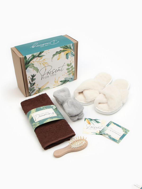 Подарочный набор "Present for you" — это стильное и практичное решение для создания атмосферы уюта и расслабления. Внутри — всё необходимое для комфортных домашних ритуалов: мягкое полотенце, уютные тапочки, плюшевая повязка и массажная щётка. Эстетичная упаковка с иллюстрацией делает его готовым подарком на любой случай.