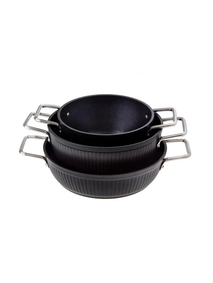 Набор посуды из износостойкого гранита с чёрным внешним покрытием и стальными ручками. Подойдёт для всех типов плит, включая индукционные, и гарантирует долговечность и лёгкий уход.