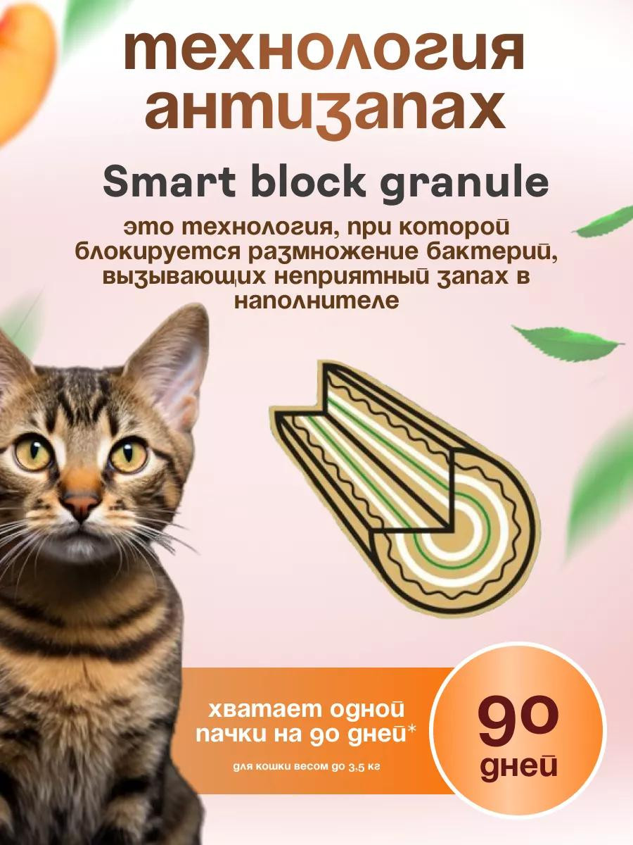 Наш комкующийся наполнитель производятся по уникальной технологии Smart-Block гранулы: антибактериальный компонент в составе соевого волокна уничтожает вредоносные бактерии, вызывающие неприятный запах из лотка. Теперь за питомцем можно не убирать до 7 дней.