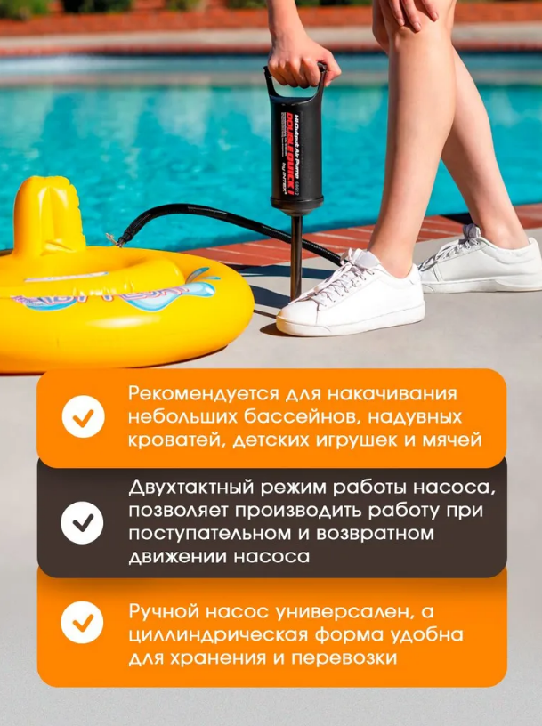 Этот универсальный насос идеально подойдет для накачивания любых надувных изделий, будь то матрас, бассейн или лодка. Благодаря удобной конструкции с упором для ног, насос работает в 2 такта - при подъеме и опускании рукоятки, что значительно ускоряет процесс накачивания. Размер устройства всего 30 см, поэтому его легко взять с собой на пикник или к водоему.