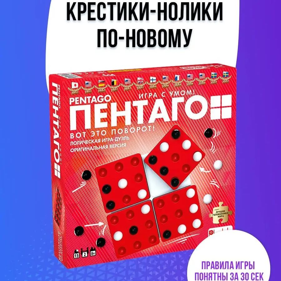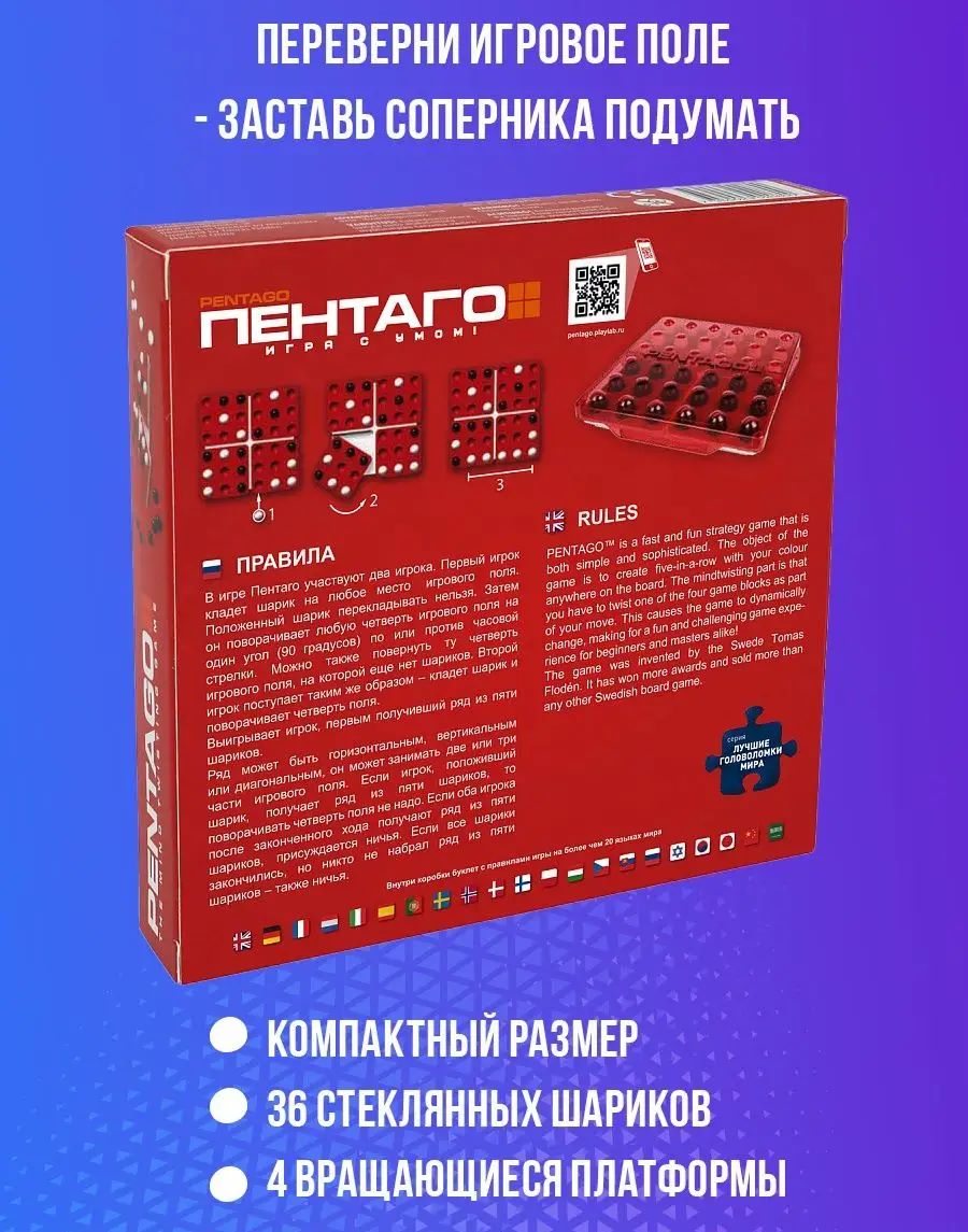 Стратегическая настольная игра для 2 игроков, придуманная в Швеции и получившая более 30 наград по всему миру. Здесь нужно думать на несколько ходов вперед и видеть пространственные варианты развития ситуации. Очень простые правила почти как в крестиках-ноликах, и при этом невероятно увлекательный и разнообразный процесс "умной игры". Среднее время игры - 15 минут. В коробке фирменного темно-красного цвета: 36 шариков из стекла (18 шариков белого цвета, 18 шариков черного цвета). Компактное, удобное игровое поле размером 16х16х1см с крышкой для фиксации шариков. Поле состоит из 4 квадратов (четвертей поля), вращающихся вокруг своих центров. Каждая четверть поля содержит 9 углублений для шариков в форме сетки 3х3. Благодаря съемной крышке игру можно остановить в любой момент, и продолжить на другом континенте! Теперь Пентаго можно брать с собой в дорогу, путешествие, поездки! Правила настольной игры Пентаго на русском и английском языках.С