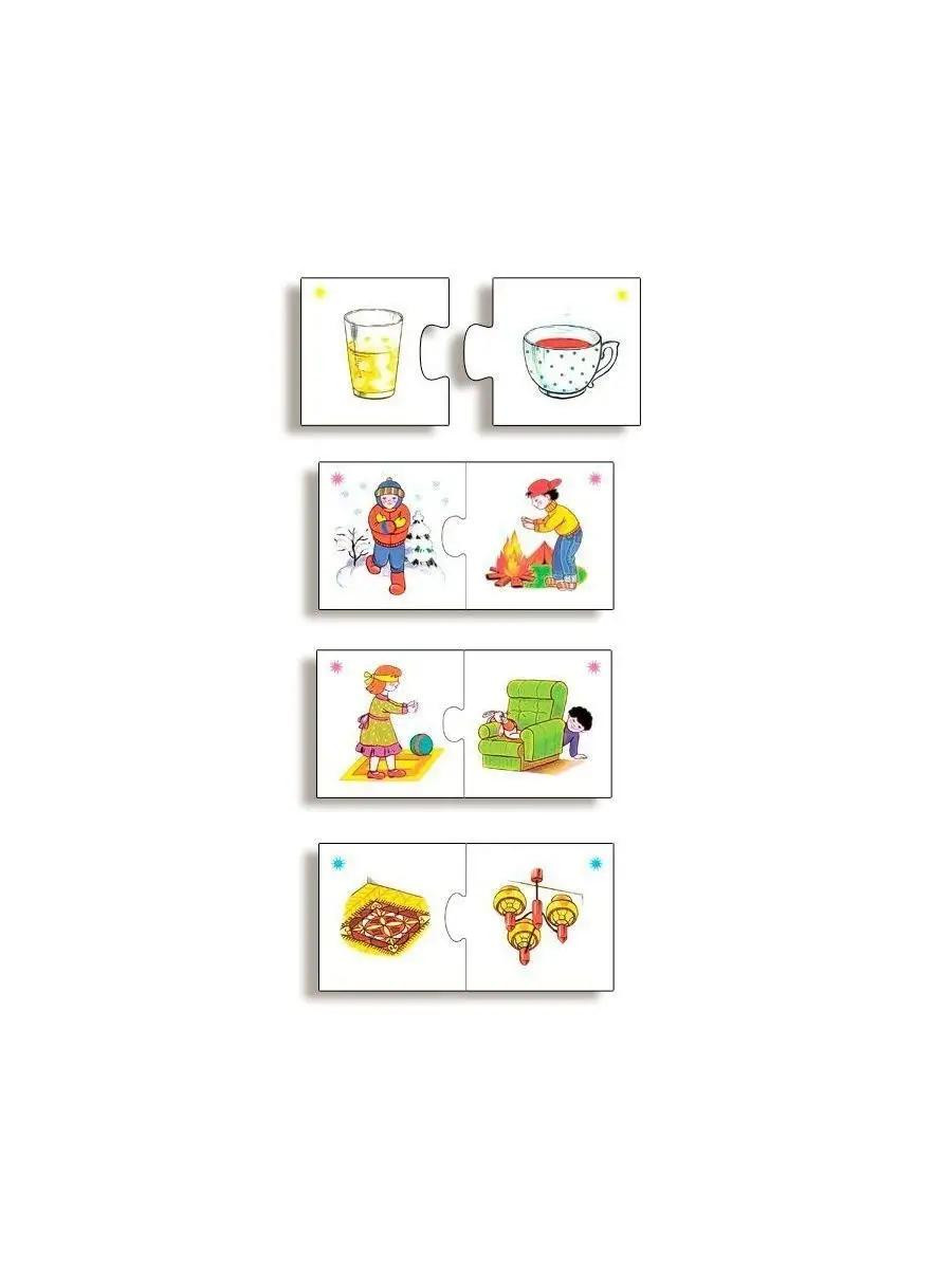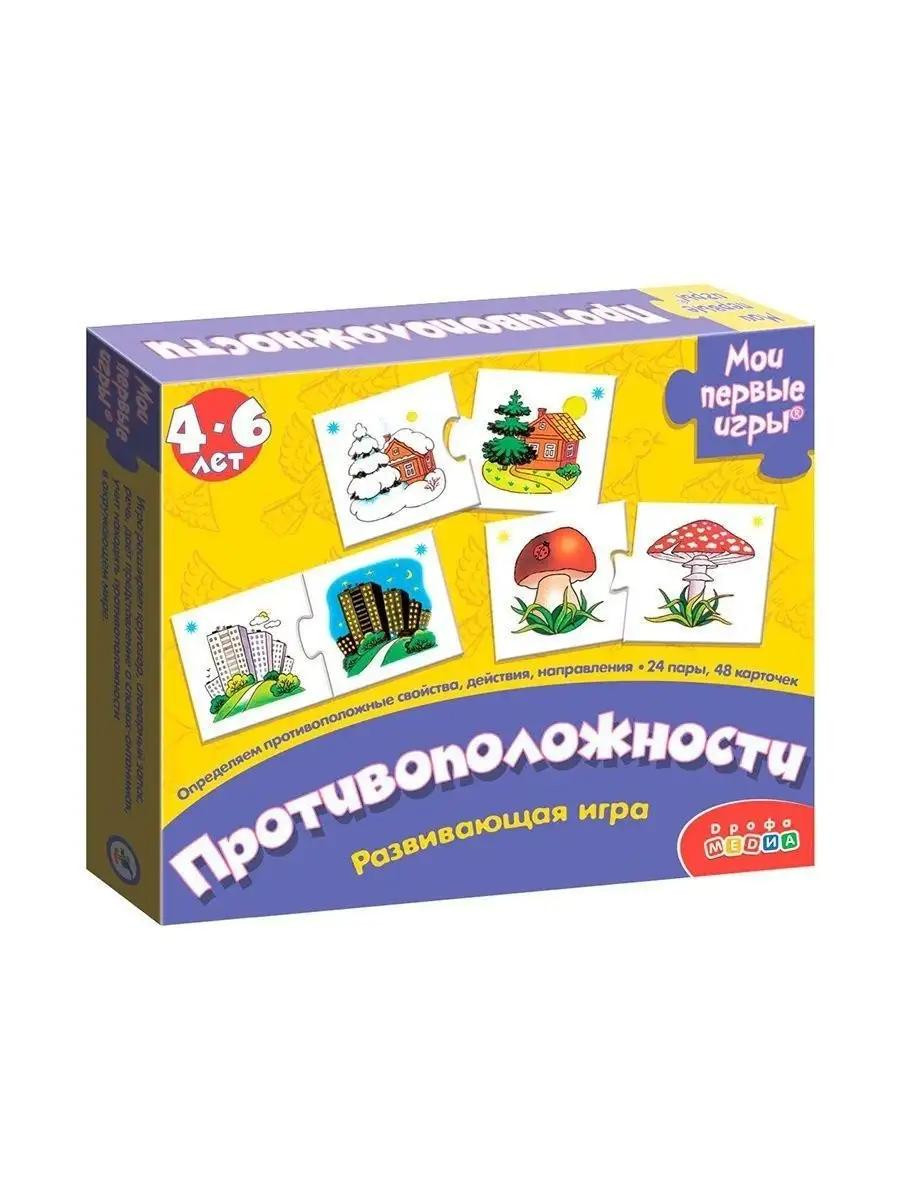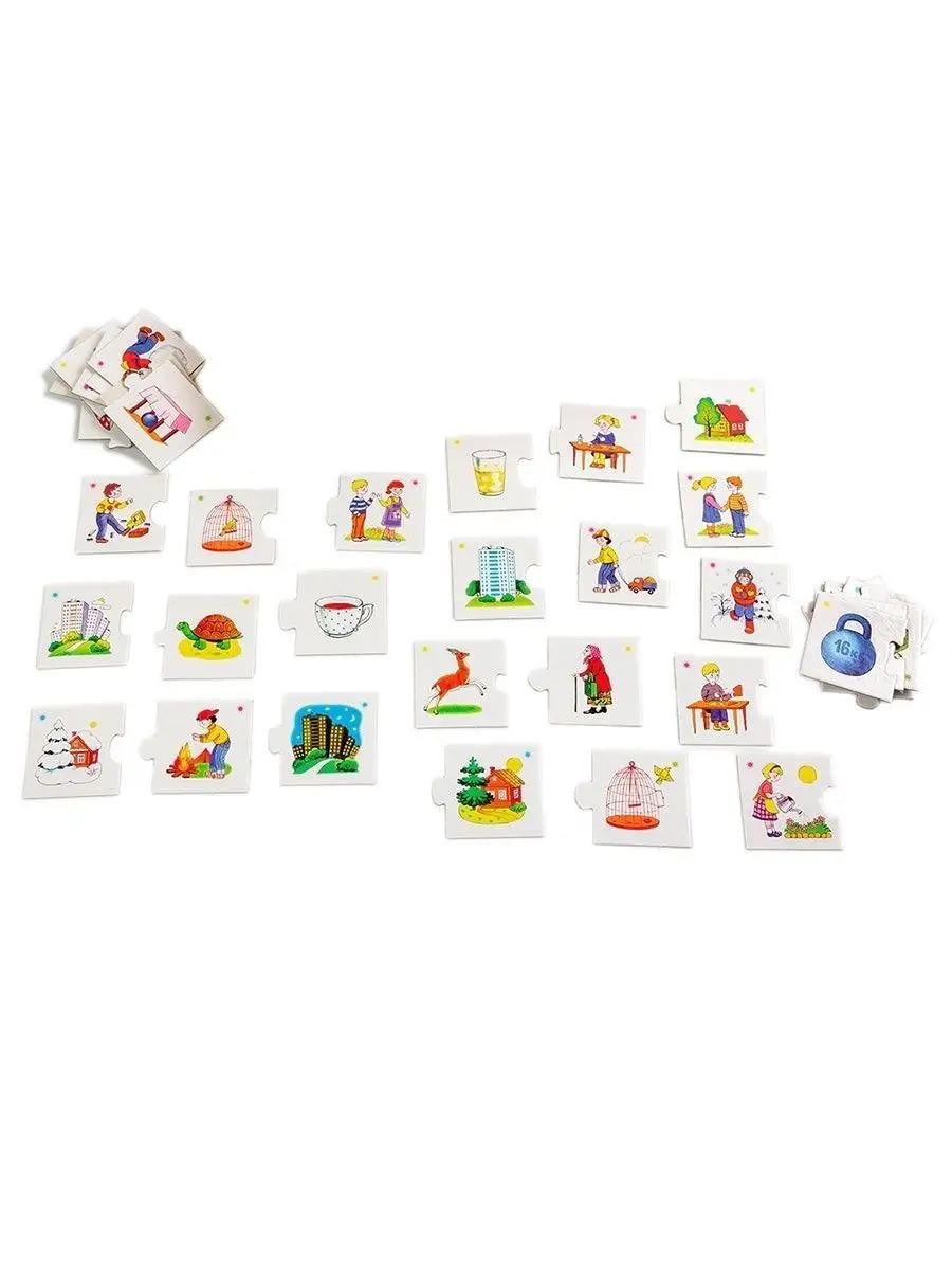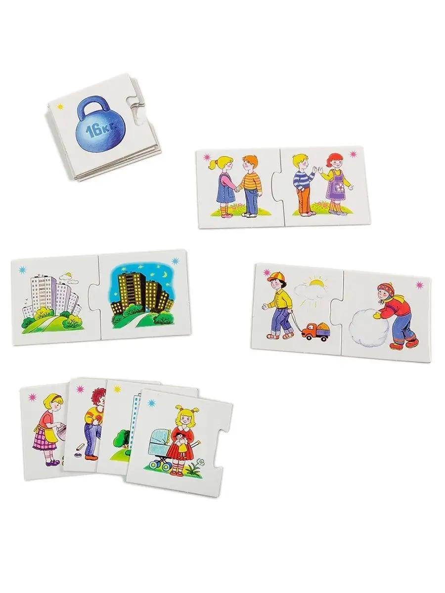 Уникальный набор развивающих игр Дрофа-Медиа разработан педагогами и психологами специально для малышей от 3 лет. Внутри коробки вы найдете 20 крупных карточек-пазлов и подробную инструкцию для родителей. Карточки из плотного картона. Парные пазлы научат ребёнка понимать и находить ассоциации. Большую роль в этом сыграют оригинальные формы пазловых замков, которые получится соединить только в том случае, если они совпадают по смыслу. Игра расширяет словарный запас и кругозор, развиваются пространственные представления. Ребёнок учится находить противоположности в окружающем мире (предметы, свойства, действия, взаиморасположение), получает первое представление о словах-антонимах.