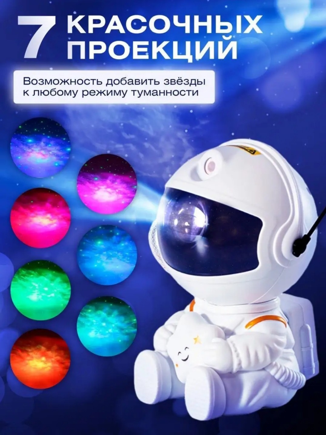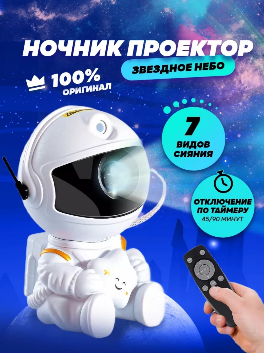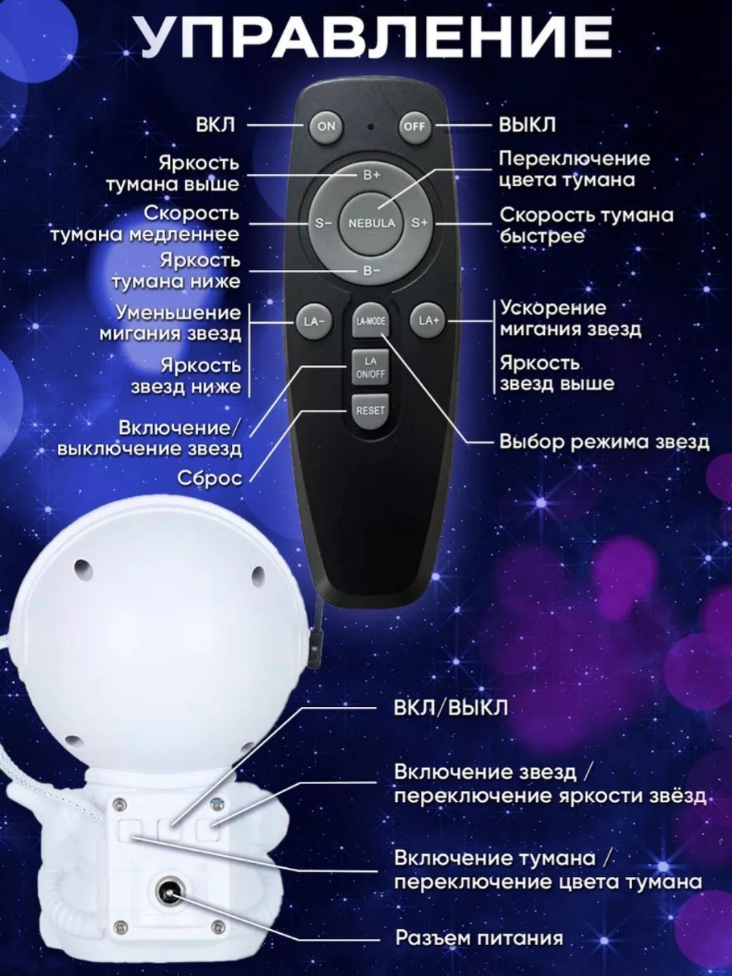 Ночник космонавт позволит создать спокойную и уютную атмосферу в любой комнате вашего дома: спальне, гостиной, детской, ванной. Проектор звездного неба имеет простое и понятное управление с помощью пульта или самого космонавта. Товар имеет подсветку в виде ночного неба, луны, туманности, звезд, космоса. Детский ночник астронавт - это настоящий домашний планетарий у Вас дома! Устройство можно использовать как помощника для безопасного и крепкого сна ребенка любого возраста: новорожденного, 3 лет, подростка. Детский ночник имеет таймер на 45 и 90 минут, он отключится самостоятельно по завершении времени. Светильник астронавт можно использовать как декоративный аксессуар, устройство точно украсит ваш интерьер. В комплекте: ночник - космонавт, пульт ДУ, Кабель питания для розетки и батарейки для пульта в подарок. Ночник работает только от сети. Проектор космонавт для дома - это оригинальный подарочный набор для мальчика и девочки, парня и девушки, любимого мужа и жены. Предмет можно подарить без повода или на День Рождения, Новый год, 23 февраля, 8 марта. Набор поставляется в красочной коробке, которая может использоваться в качестве подарочной. Ночник луна - идеальный подарок для детей и взрослых. Приятных Вам покупок