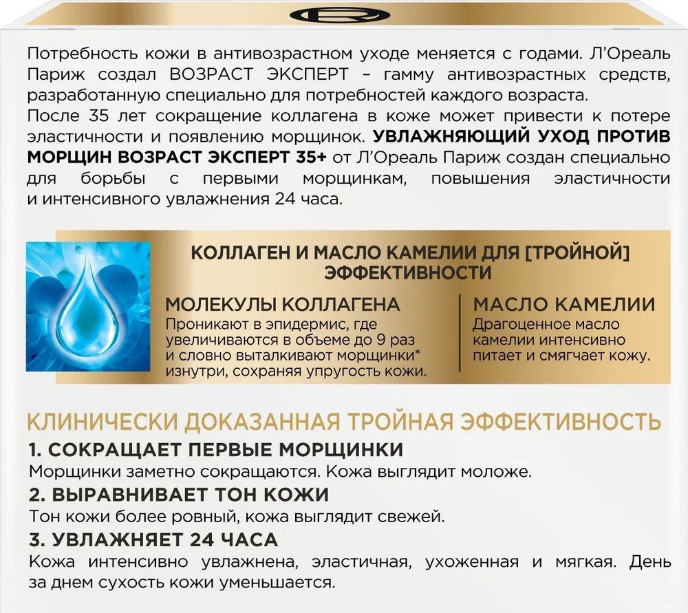 Увлажняющий уход против морщин Возраст Эксперт 35+ от L'Oreal Paris (Лореаль Париж) создан специально для борьбы с первыми морщинками, повышения эластичности и интенсивного увлажнения 24 часа.Молекулы коллагена проникают в эпидермис, где увеличиваются в объеме до 9 раз и словно выталкивают морщинки изнутри, сохраняя упругость кожи. Масло камелии способствует интенсивному питанию и мягкости кожи.
