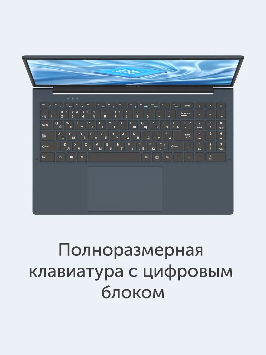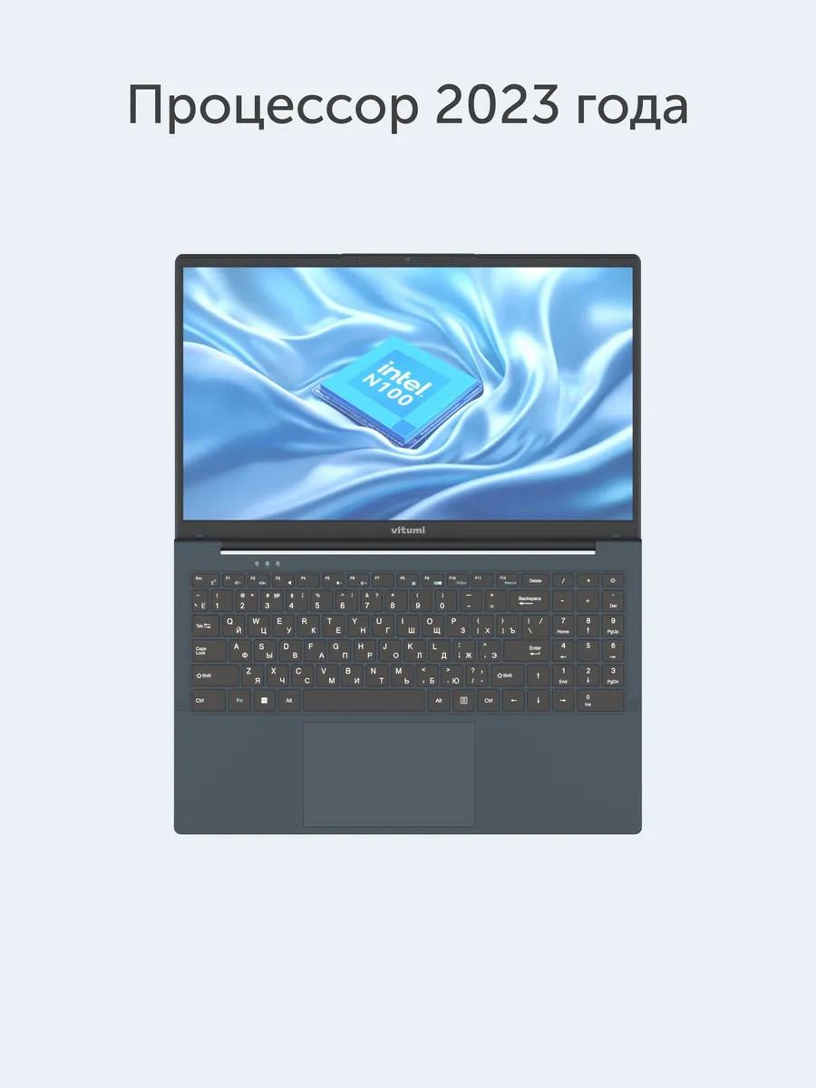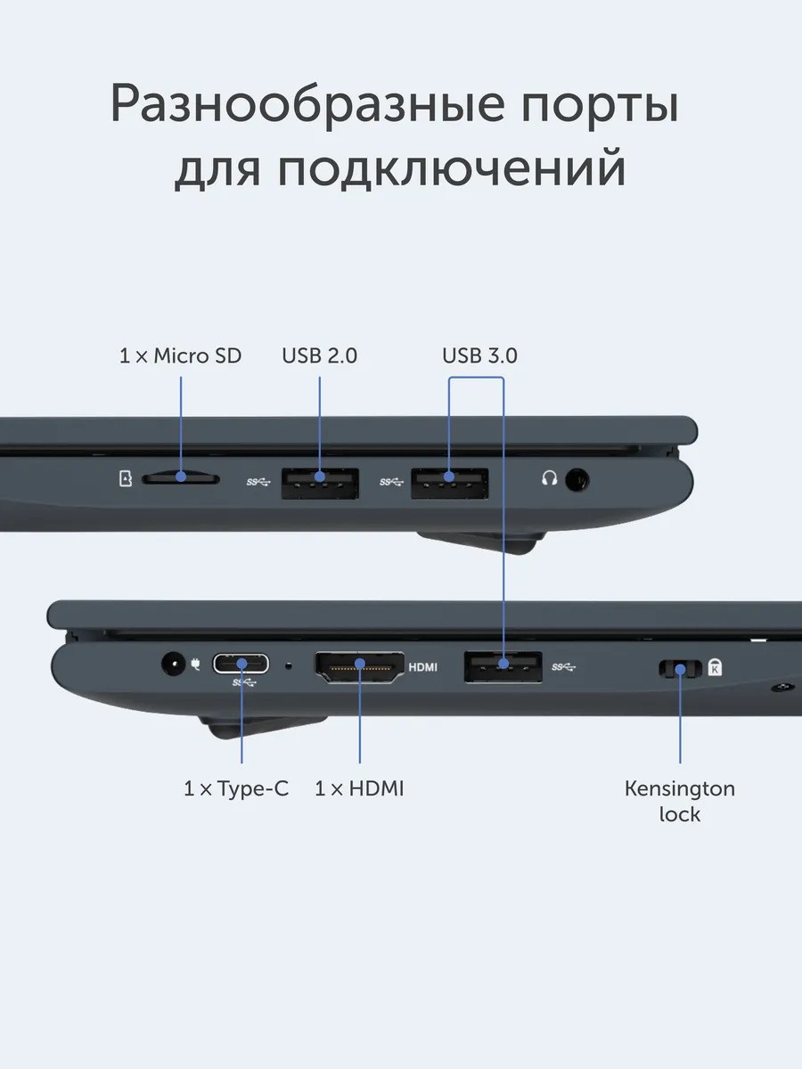 Современный 4-ядерный процеccop Intel N100 легко справляется с офисными приложениями просмотром видео и нетребовательными играми С оперативной памятью DDR5 объёмом 8 ГЕ ноутбук будет плавно работать в режиме многозадачности. Для хранения и быстрой загрvзки файлов есть SSD-накопитель на 256 ГБ Аккумулятор ёмкостью в 5000 МА*ч обеспечивает долгую и стабильную работу без подзарядки. В комплекте есть компактное зарядное устройство
