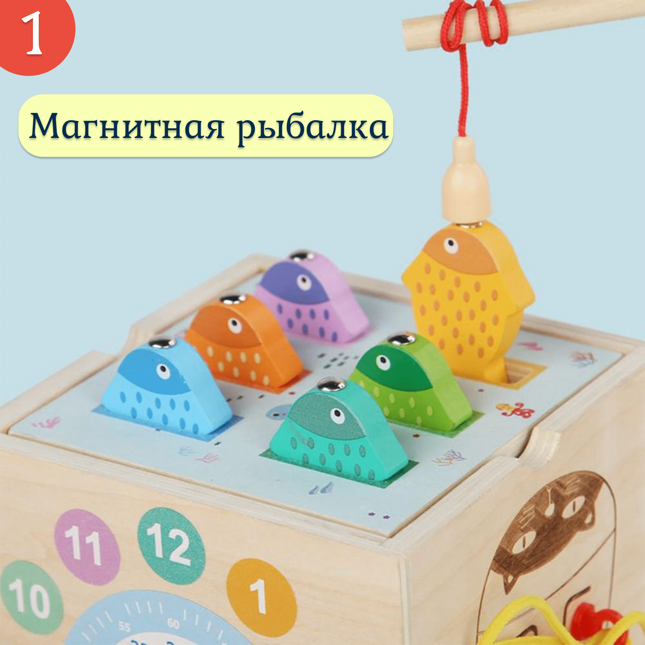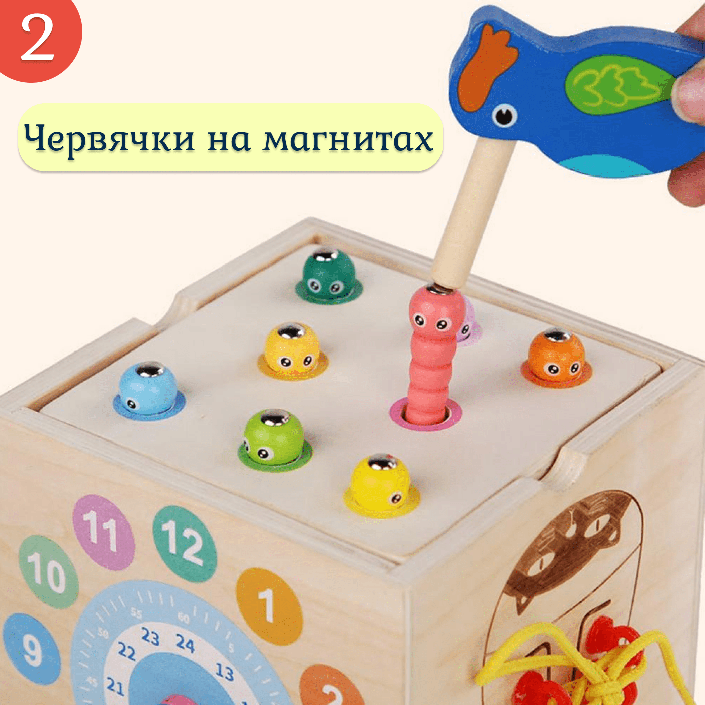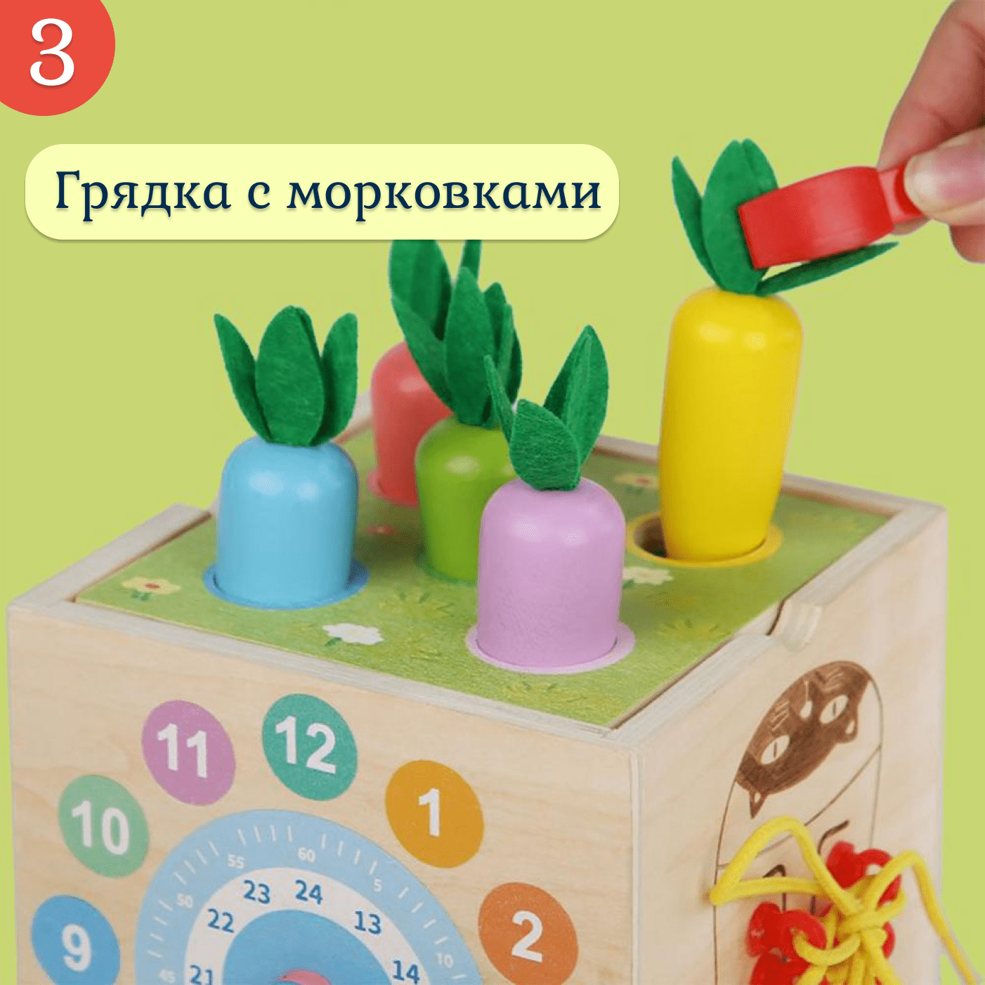 Деревянный сортер куб - это уникальная развивающая игрушка, которая поможет деткам развить умение сортировать и классифицировать предметы по цвету и форме. Игровой набор включает в себя сразу несколько популярных игр Монтессори для малышей: Червячки на магнитах; Шнуровка для детей; Геометрические фигуры; Учим время на часах; Сортер морковки. В лунки нужно отсортировать по цвету морковки, а собрать их с помощью детского пинцета; Магнитная рыбалка детская. На территории голубого поля необходимо разместить рыбок на магните и поймать добычу можно с магнитной удочкой.Наша деревянная игрушка станет незаменимым помощником в развитии Вашего чада и отличным подарком на 23 февраля, 8 марта, День рождения и любой другой праздник.