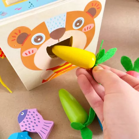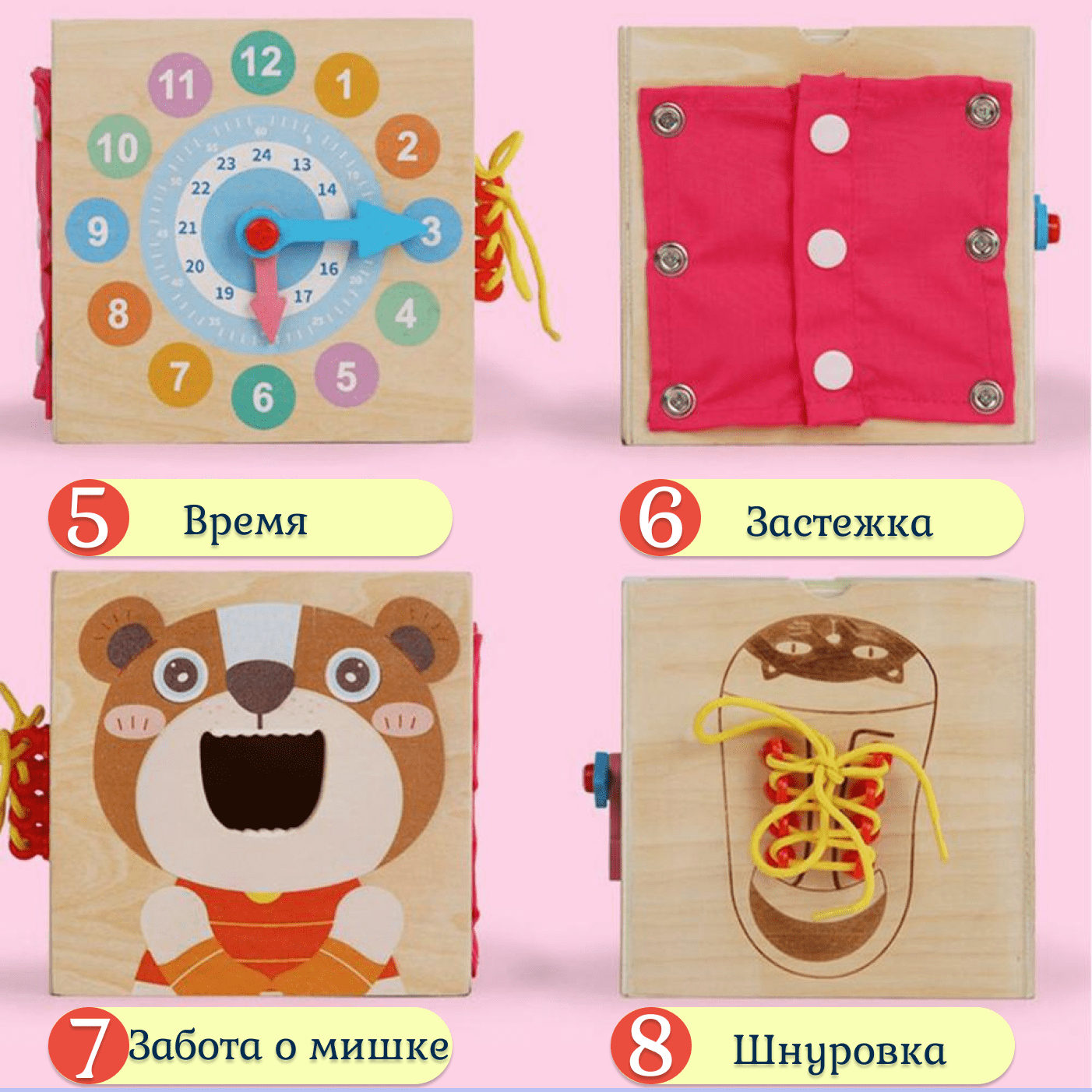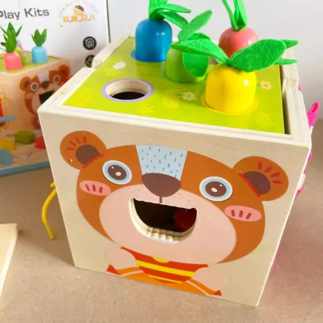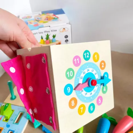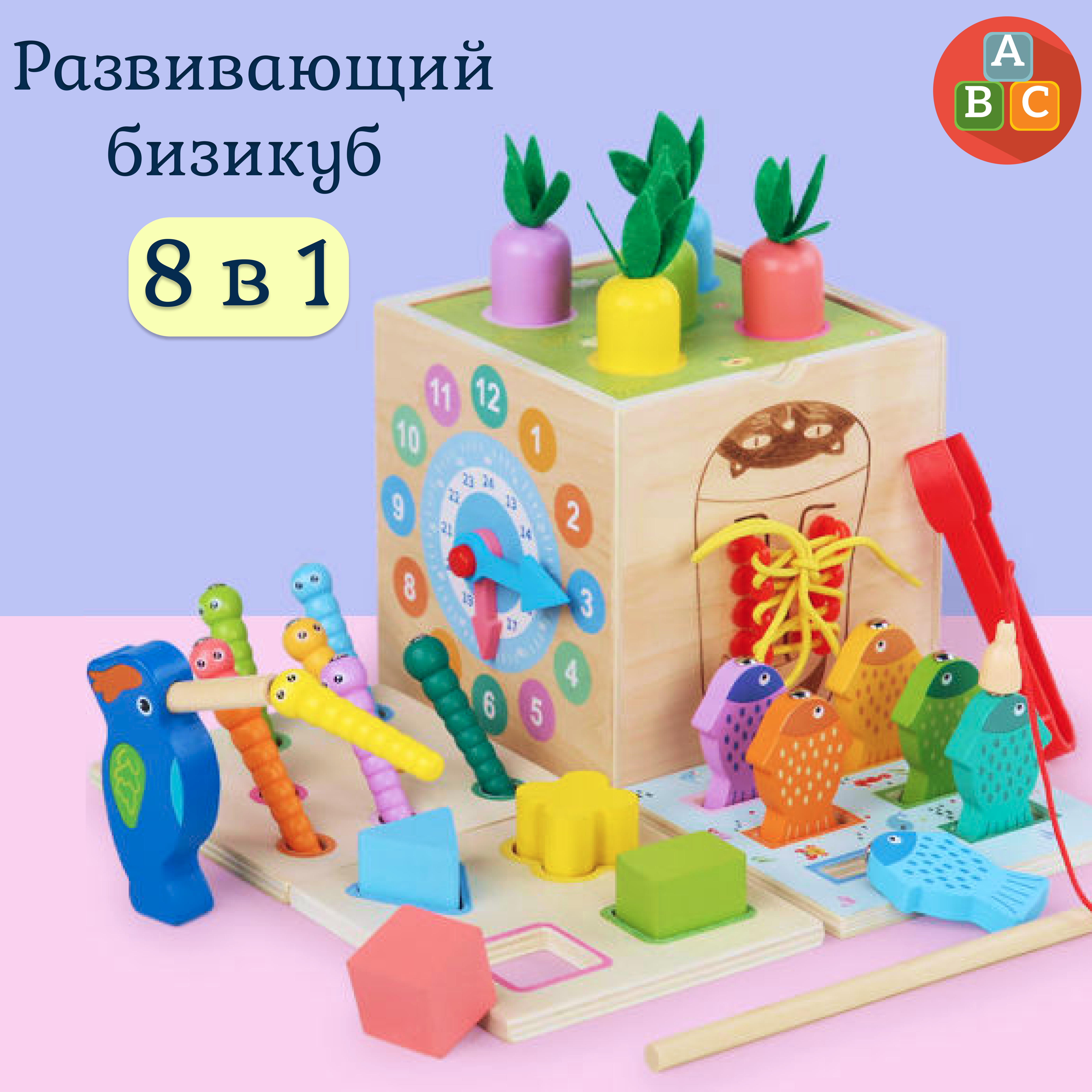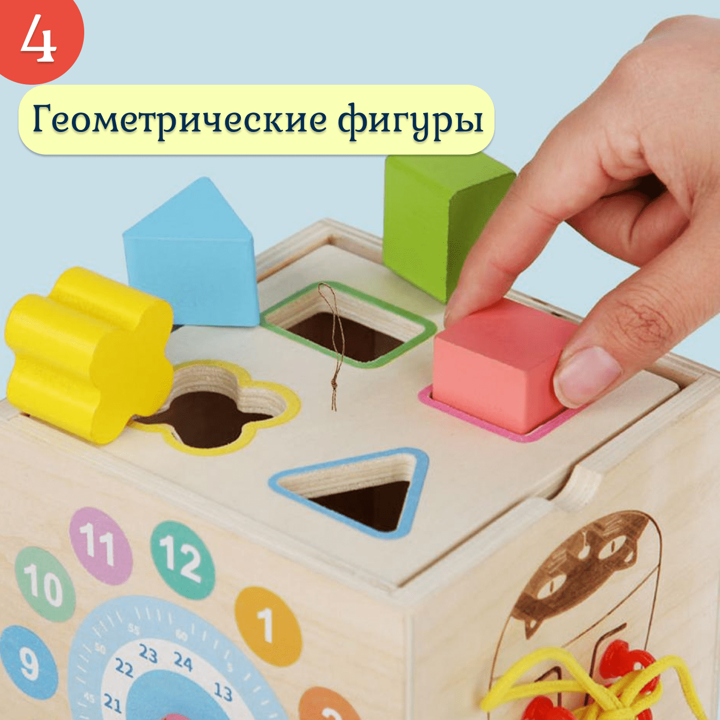 Деревянный сортер куб - это уникальная развивающая игрушка, которая поможет деткам развить умение сортировать и классифицировать предметы по цвету и форме. Игровой набор включает в себя сразу несколько популярных игр Монтессори для малышей: Червячки на магнитах; Шнуровка для детей; Геометрические фигуры; Учим время на часах; Сортер морковки. В лунки нужно отсортировать по цвету морковки, а собрать их с помощью детского пинцета; Магнитная рыбалка детская. На территории голубого поля необходимо разместить рыбок на магните и поймать добычу можно с магнитной удочкой.Наша деревянная игрушка станет незаменимым помощником в развитии Вашего чада и отличным подарком на 23 февраля, 8 марта, День рождения и любой другой праздник.
