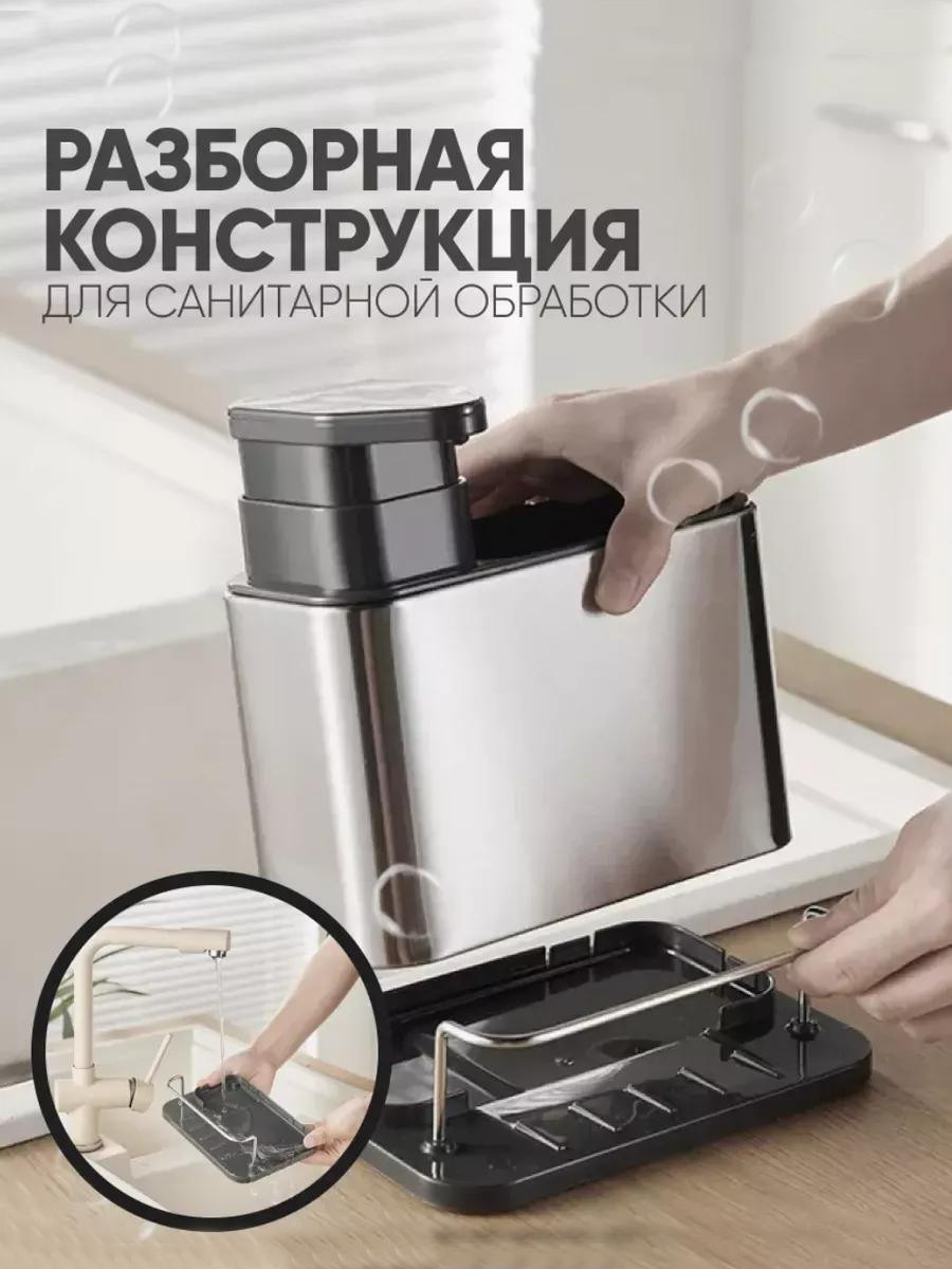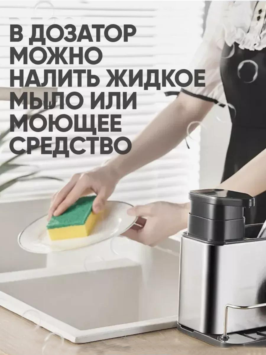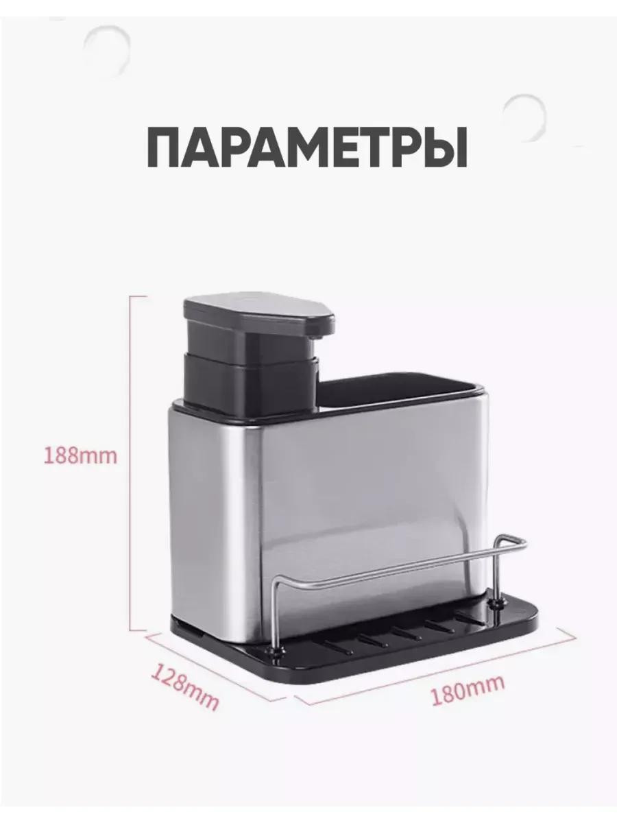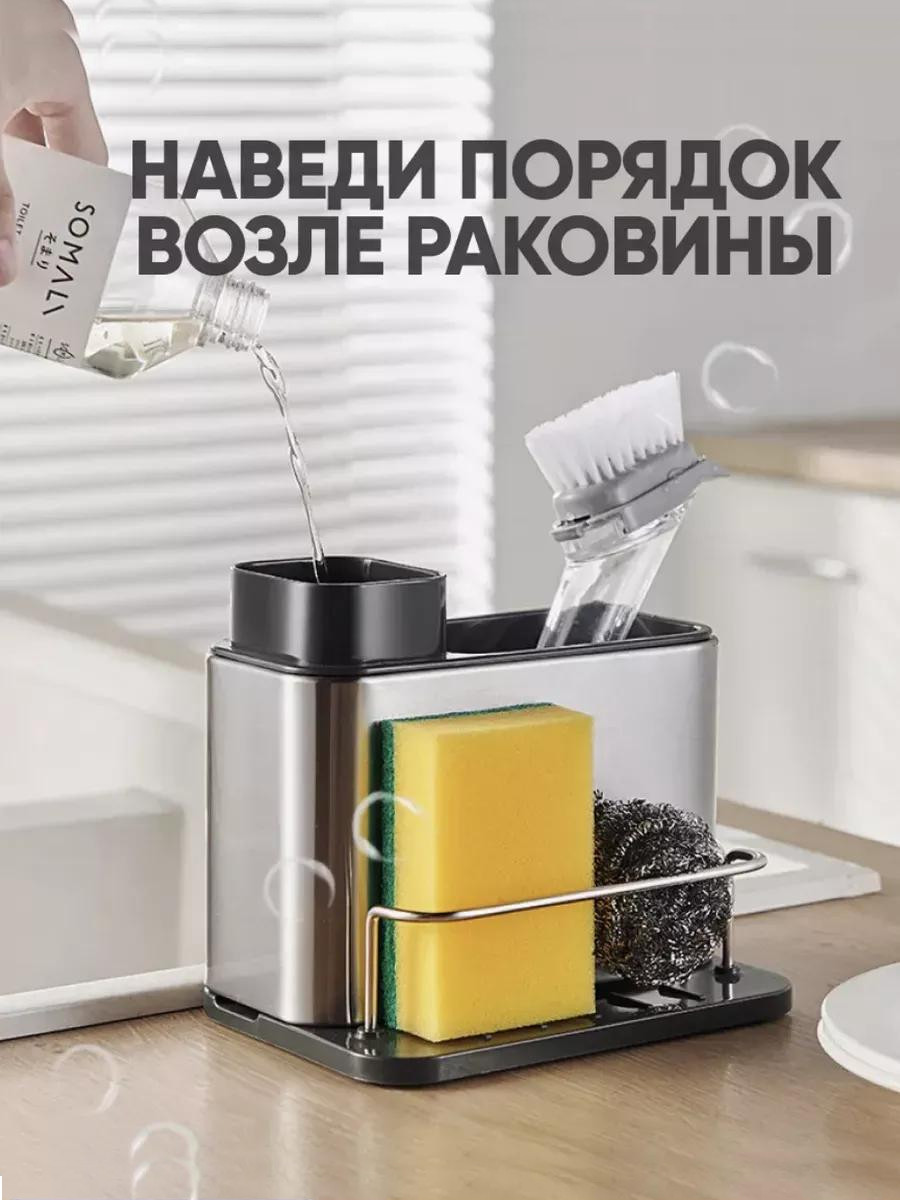Диспенсер - органайзер поможет сохранить больше свободного места на кухонной раковине и грамотно организовать рабочее пространство на кухне. Такой кухонный диспенсер избавит Вас от лишнего цветового шума пестрых этикеток на бутылках моющих средств и поможет не только организовать место для губок, но и сохранить в чистоте раковину и столешницу. Подставка обладает удобной для хранения и использования прямоугольной формой. Благодаря такой форме органайзера ему легко найти место на мойке. Подставка может быть использована не только на мойке для посуды. Держатель удобен в использовании и в ванной как стакан для зубных щеток и дозатора для жидкого мыла. Также она прекрасно будет Вам служить как держатель для щеток и тряпок в коридоре, а дозатор можно наполнить кремом для рук. Благодаря своему сдержанному и одновременно стильному внешнему виду, такой лоток для кухонной утвари - это универсальное интерьерное решение для дома, дачи, в ресторан или в офис на кухню. Безопасные и надежные материалы, такие как нержавеющая сталь и АБС пластик, обеспечивают долговечность и качество товара. Устойчивая конструкция и противоскользящие накладки на основании органайзера предотвращают его скольжение и обеспечивают его стабильность. Подставка для губок на мойку имеет размеры 18 см в длину, 12,8 см в ширину и 18,8 см в высоту.
