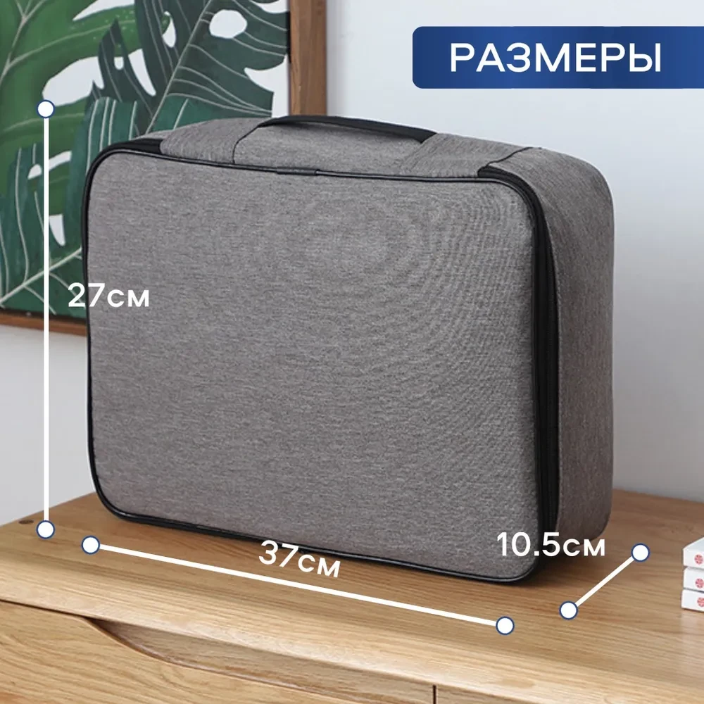 Органайзер сумка для хранения документов и вещей с кодовым замком Органайзер для хранения документов с кодовым замком необходимая и нужная вещь в доме . Паспорта , свидельства , дипломы налоговые , медицинские и другие семейные документы будут под рукой , аккуратно разложены в папке . Кейс для хранения вещей подойдет для канцелярии , для зарядных устройств , игрушек , лекарств , бижутерии и ювелирных изделий . С папкой для хранения размером 37х27х10,5 см . и двумя внутреними дополнительными вкладышами быстро найти необходимую вещь . Кейс для документов крепится на чемодан с помощью специального ремня , для дальних поездок и путешествий. Органайзер с кодовым замком гарантирует безопасность ценных бумаг и личных вещей (заводской пароль - 3 ноля (000) . Сумка для хранения нужная вещь в путешествиях и командировках . Сумка дорожная сохранит детские принадлежности для творчества , лекарства , игрушки , принадлежности для рукоделия гаджеты и другие аксессуары , а также предметы женской и мужской косметики . Портфель универсальный для поездок , путешествий , на работу , кейс вмещает необходимые бумаги формата А4 и другие . На крышке короба для хранения предусмотрено 4 отсека для паспортов . Органайзер для канцелярии изготовлен из плотной , водоотталкивающей ткани . Органайзер используют как дорожную сумку , сумку для роддома , сумку для ноутбука , сумку в багажник . Папка для тетрадей хороший подарок для мамы , папы , мужа , сына , брата , друга , коллеги , учителя . Сумка заменит ящики для хранения , короба , контейнеры а также сумки переноски ноутбука .