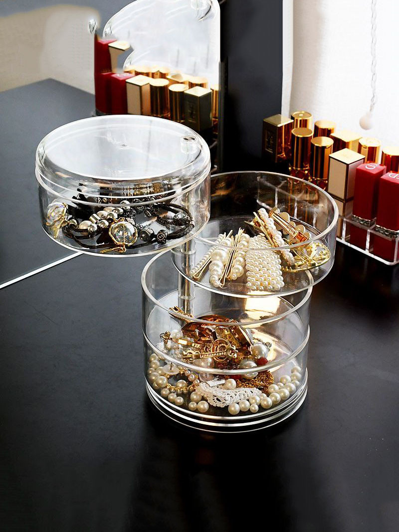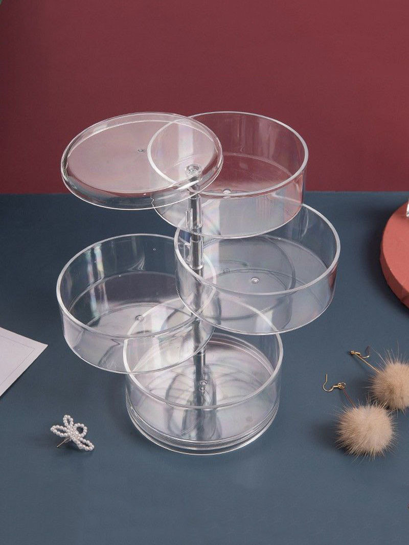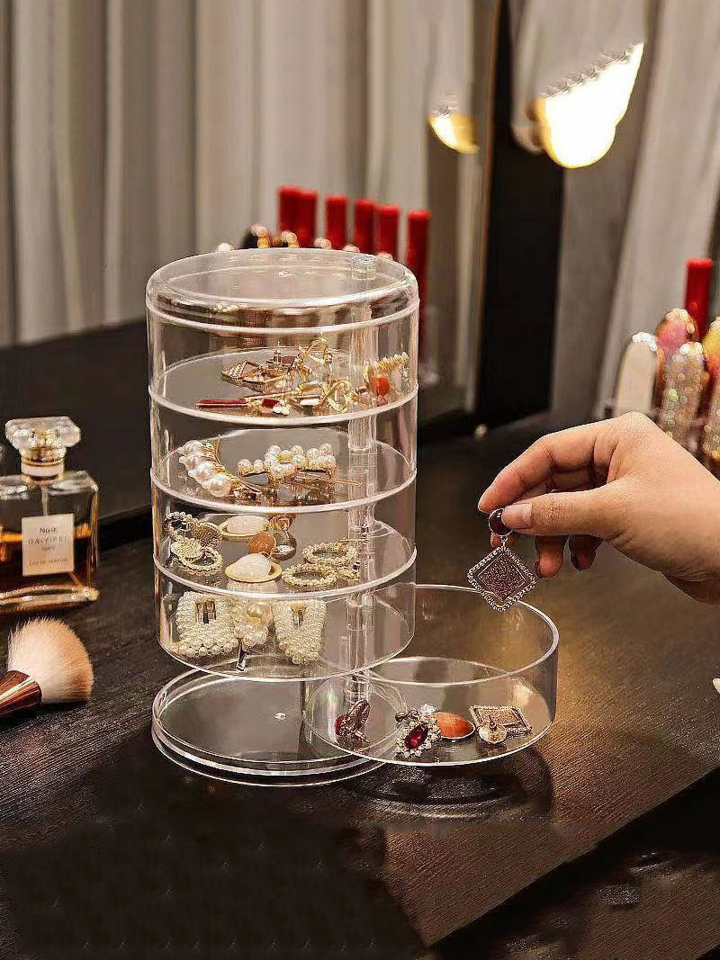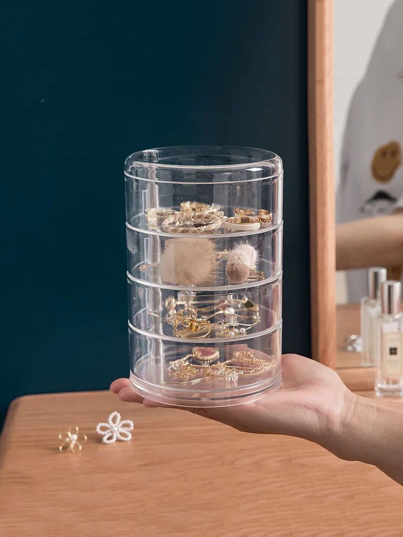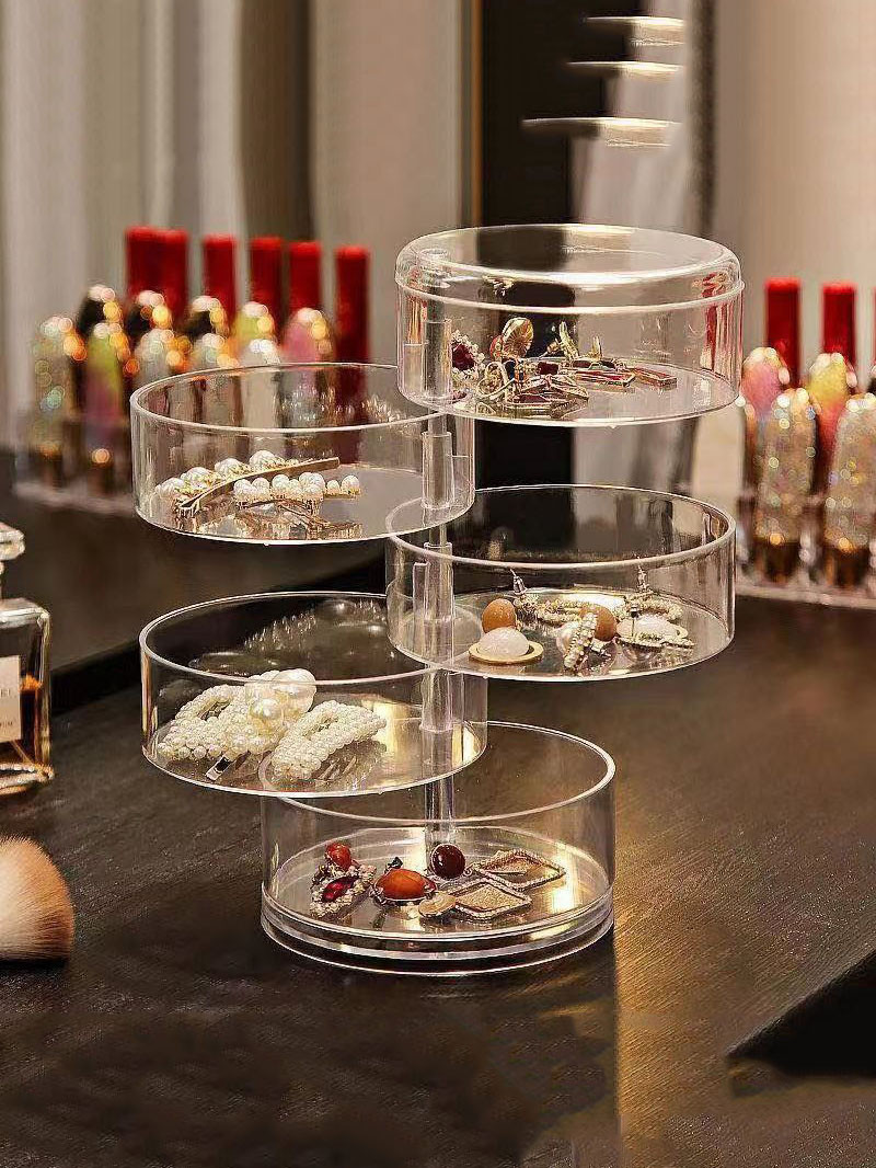 Функциональный и стильный органайзер с четырьмя выдвижными ярусами — идеальное решение для хранения колец, серёжек, брошей и других мелких аксессуаров. Прозрачный дизайн позволяет легко находить нужные украшения, а поворотная конструкция обеспечивает удобный доступ к каждому ярусу.
