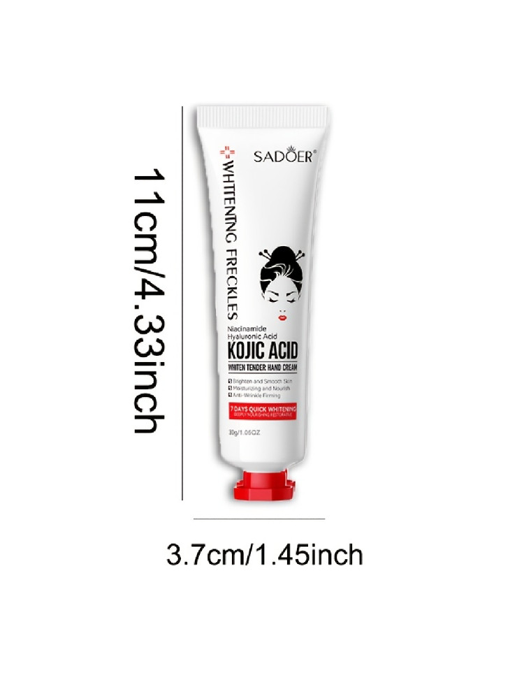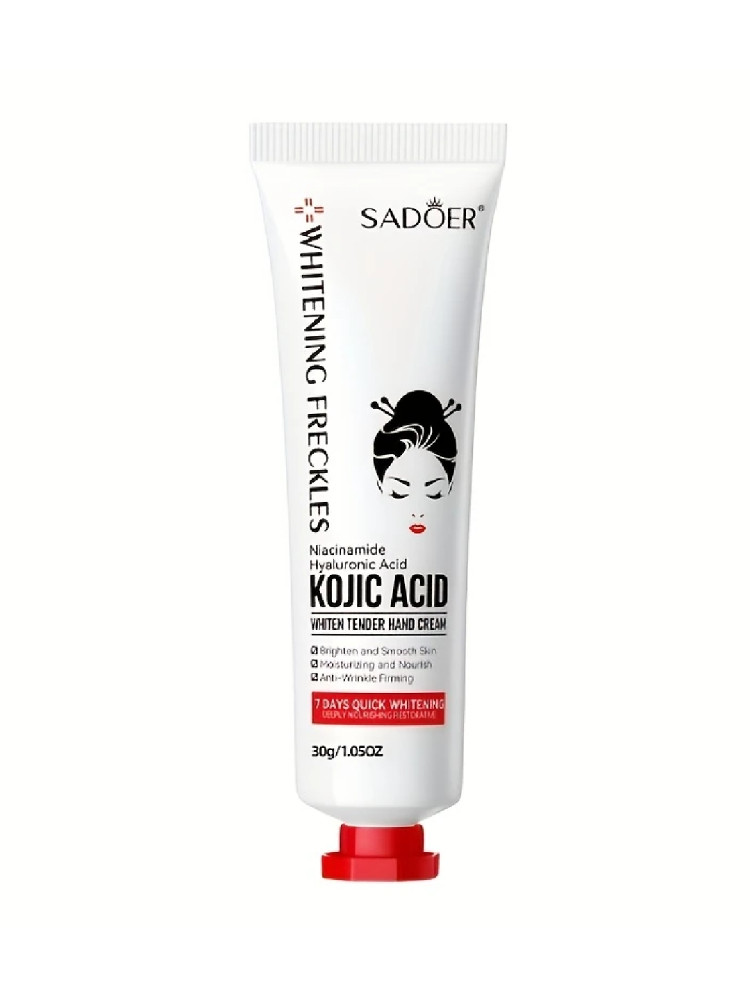 Осветляющий крем для рук против веснушек Sadoer с койевой кислотой 30 гр. Крем для рук против веснушек с койевой кислотой - это идеальное решение для тех, кто мечтает о здоровой и ровной коже. Койевая кислота, известная своими свойствами по снижению пигментации, бережно воздействует на верхний слой кожи, помогая осветлить веснушки и устранить недочеты.