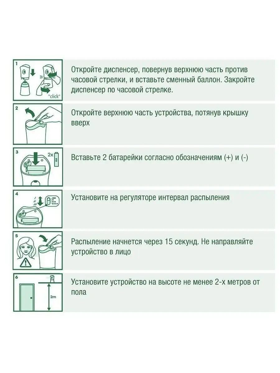 Установите диспенсер на высоте не менее 2 м от пола, в зоне с хорошей циркуляцией воздуха (кухня, спальня, гостиная, ванная/туалет).
